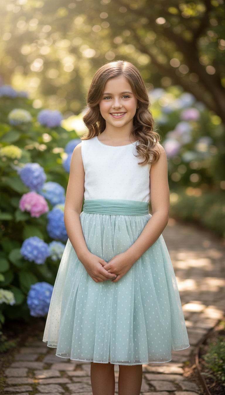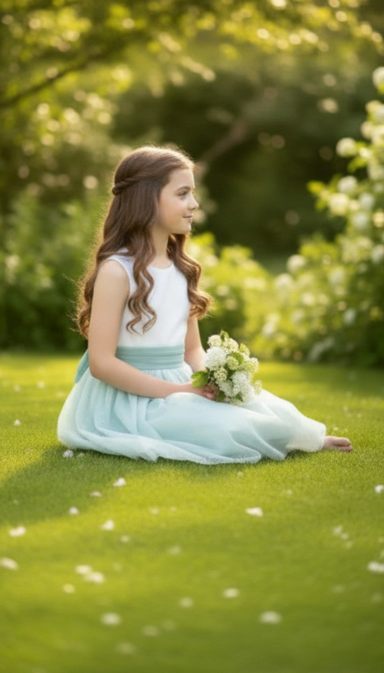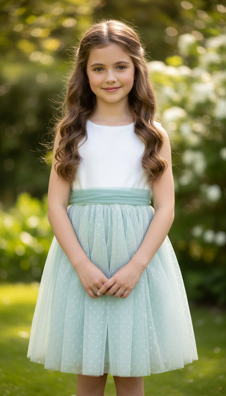 Vestido de tul plumeti con cuerpo blanco sin mangas y falda en tul verde con fajín de tul verde empolvado.