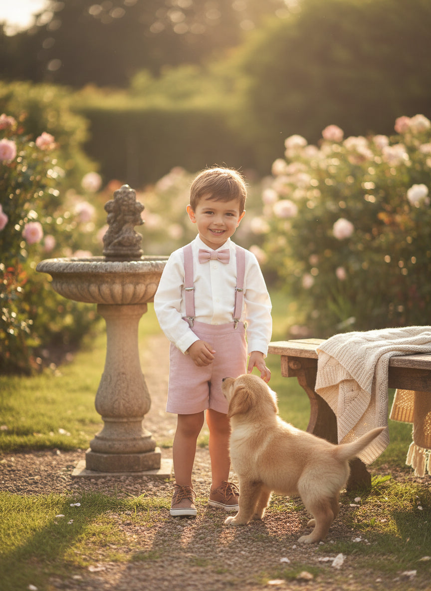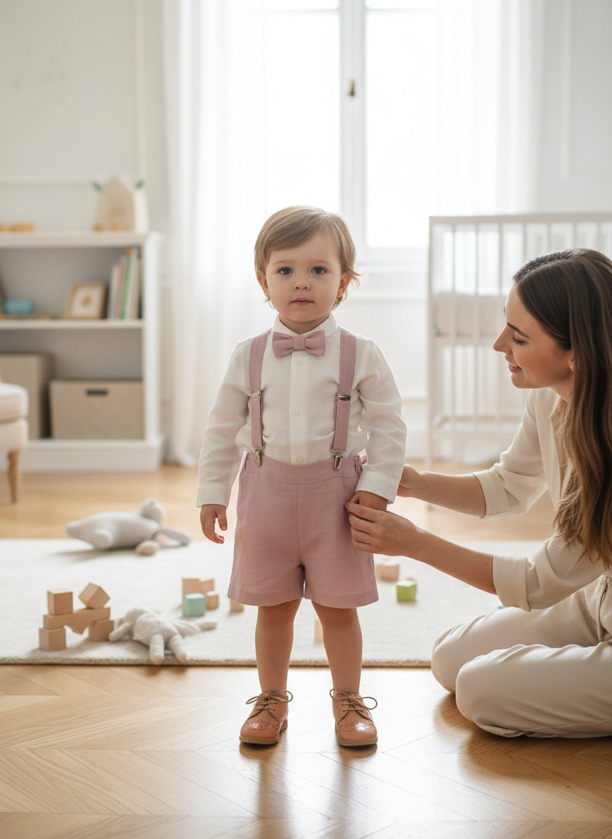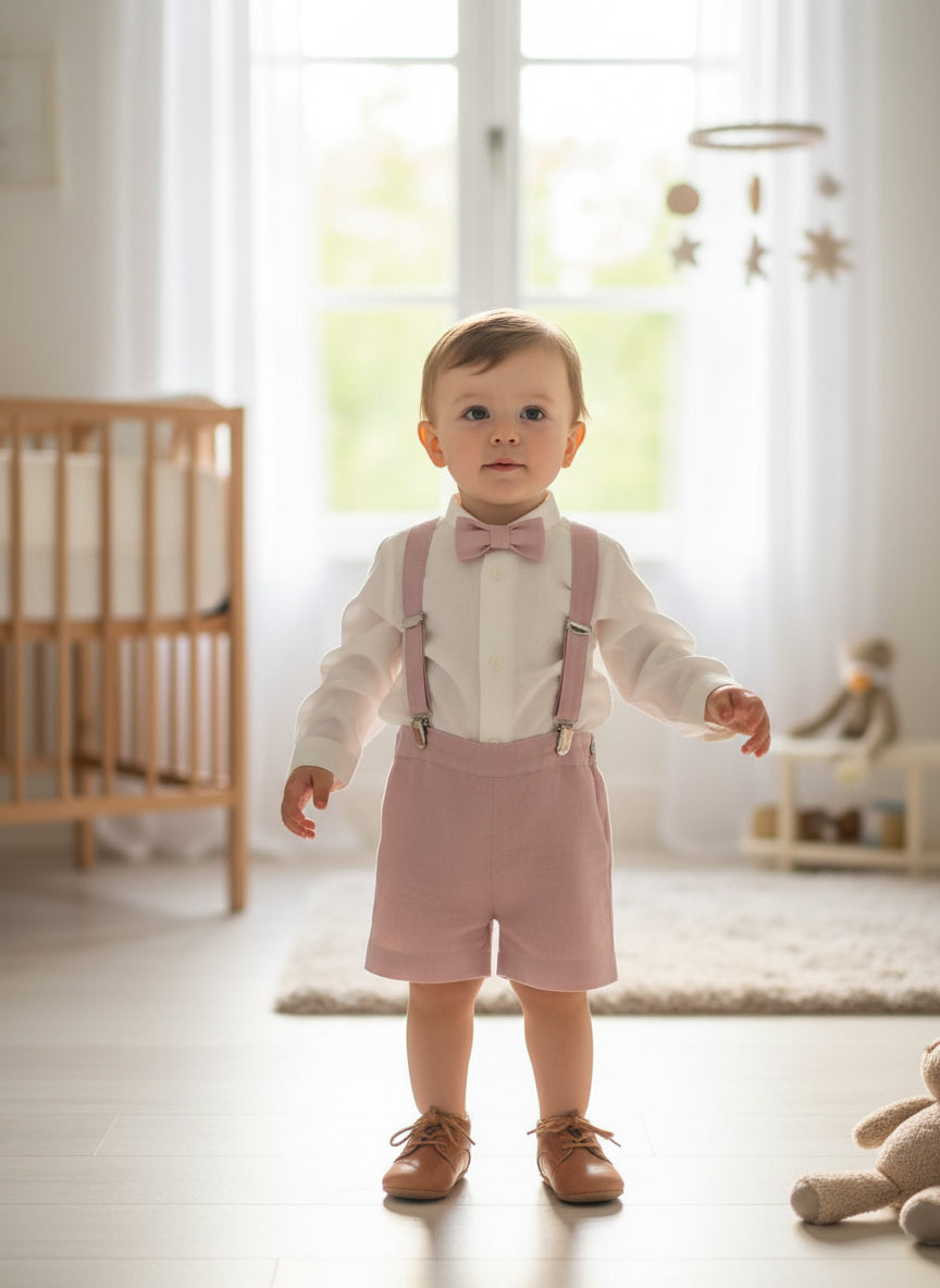 Conjunto camisa, short rosa empolvado, tirantes y pajarita