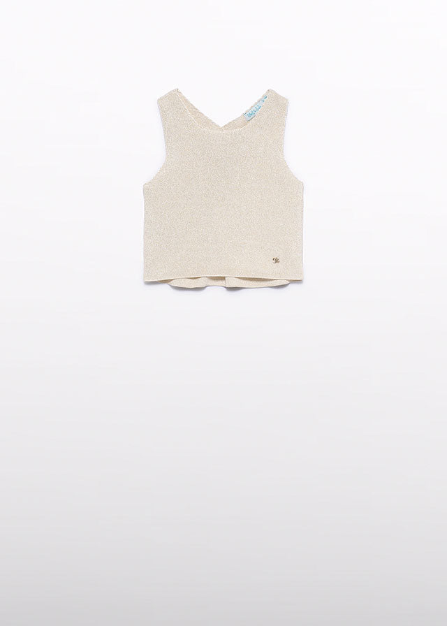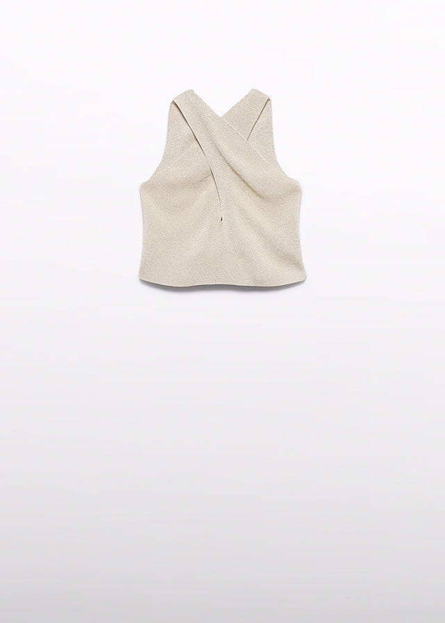 Conjunto elegante en tonos neutros compuesto por un top de tricot suave con un ligero brillito y cruzado por detrás y un pantalón con detalles de guipur.