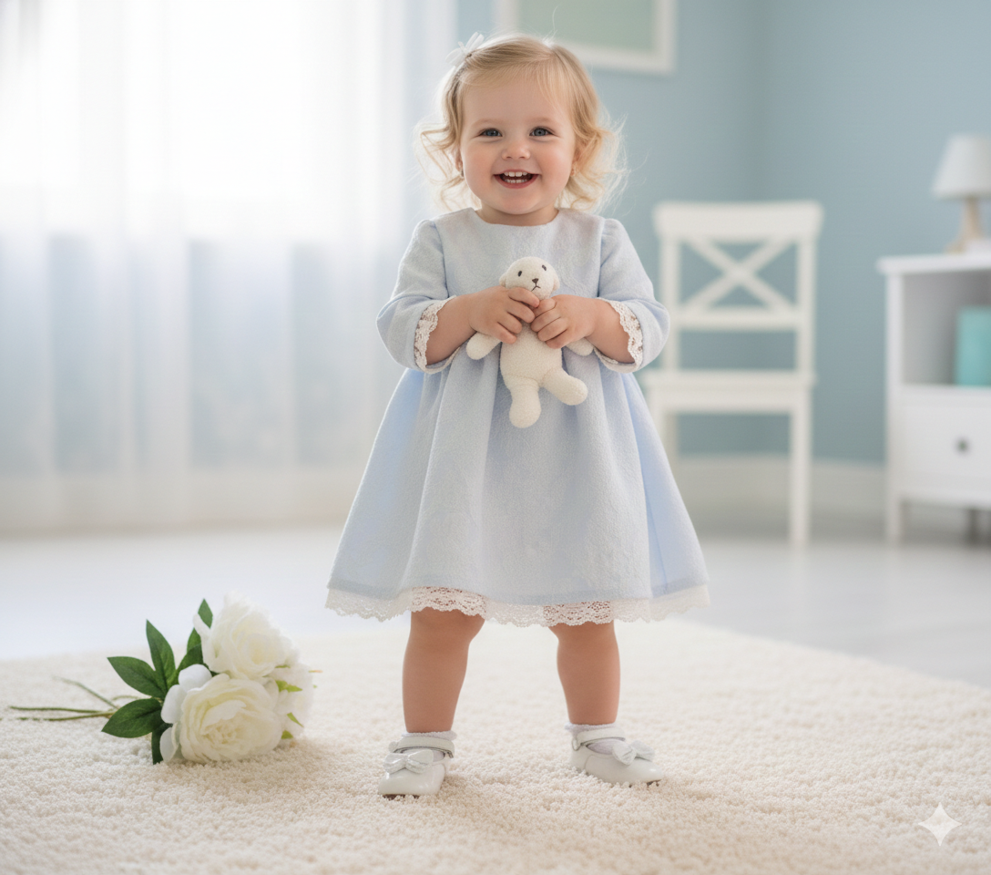 El brocado azul proporciona textura y profundidad, mientras que la puntilla en contraste añade un toque de sofisticación y feminidad. Ideal para niñas que buscan un look distinguido y atemporal.