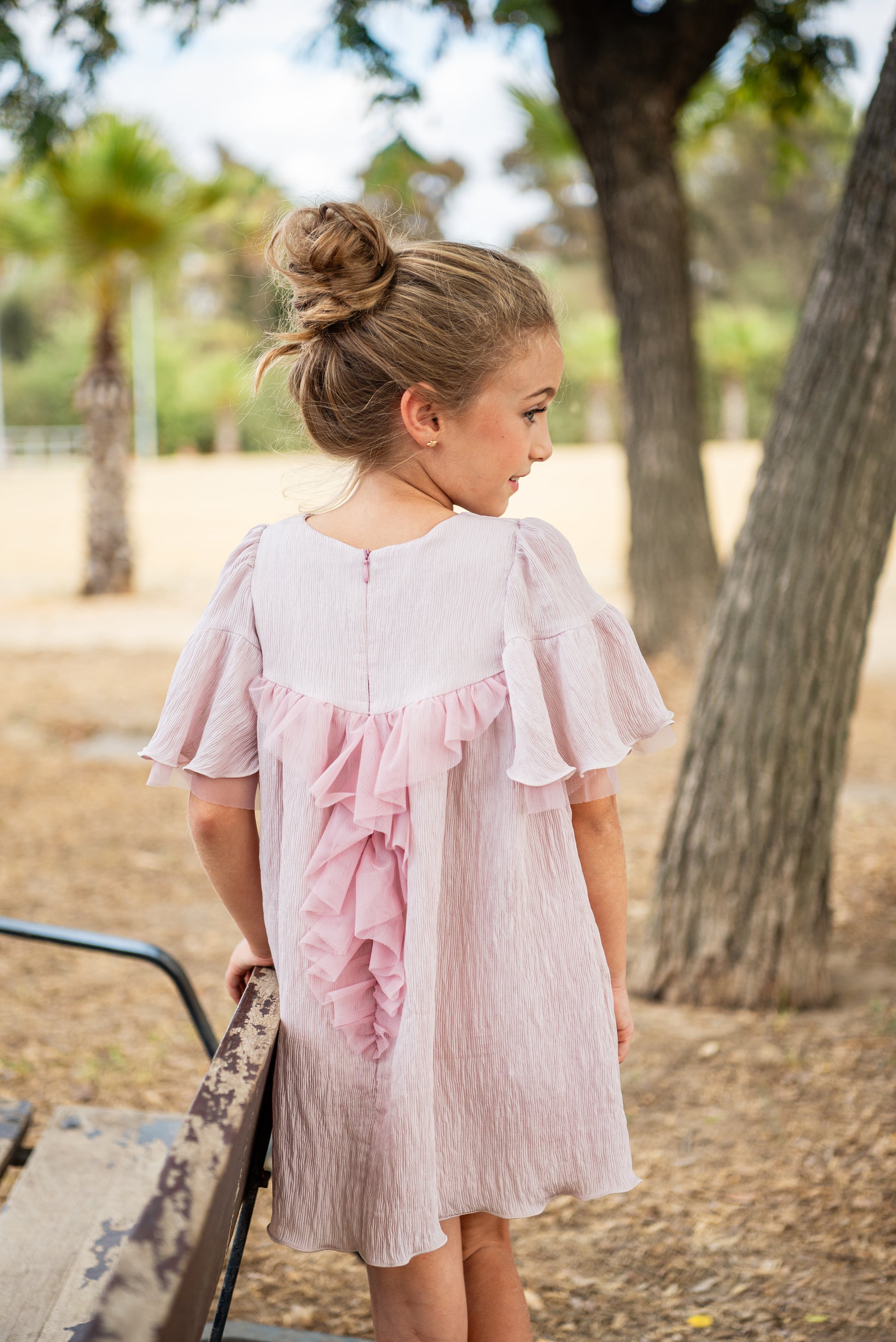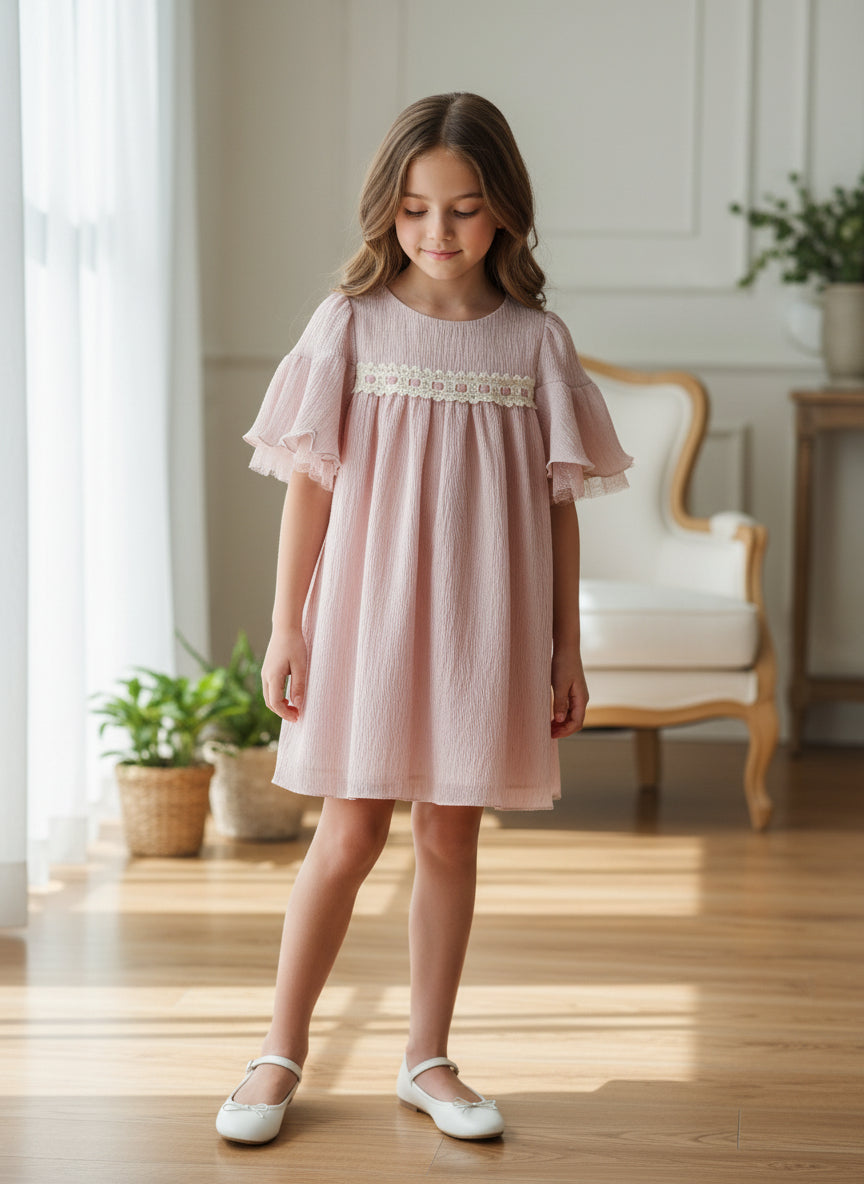 Descubre la elegancia atemporal del Vestido "Geisha", confeccionado en gasa plisada de rosa empolvado. Su diseño delicado combina sofisticación con comodidad, presentando mangas cortas que lo hacen perfecto para ceremonias, celebraciones especiales y eventos de primavera. Los pliegues cuidadosamente trabajados crean movimiento y volumen, mientras que el tono rosa empolvado aporta un toque de distinción y feminidad. Una pieza versátil que trasciende tendencias, ideal para niñas que desean lucir radiantes en cualquier ocasión.