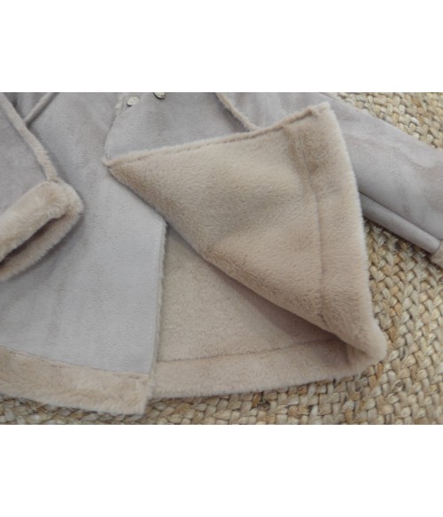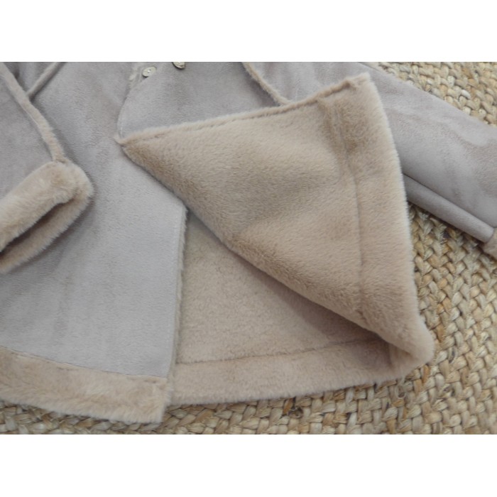 Pelliza de ante con capucha color nuez, interior de pelito extra suave. Mangas, capucha, puños y bordes del mismo pelo. Botones imitación madera.