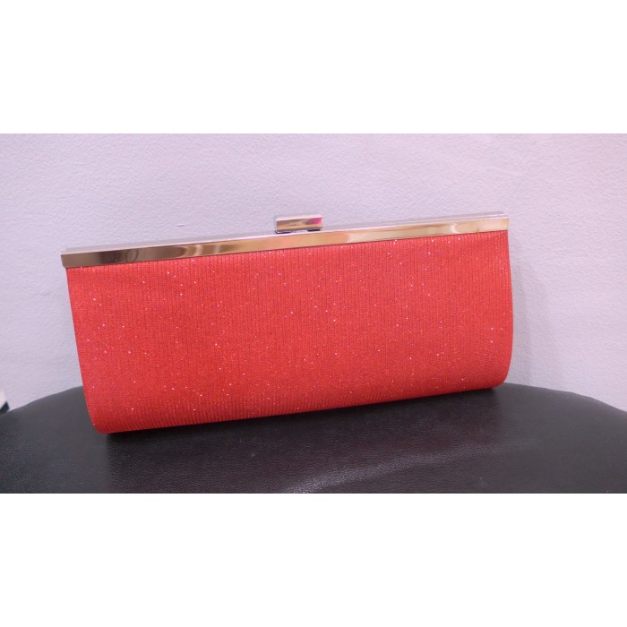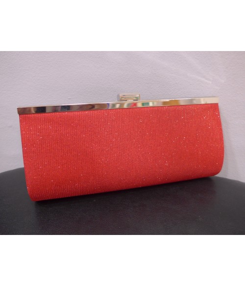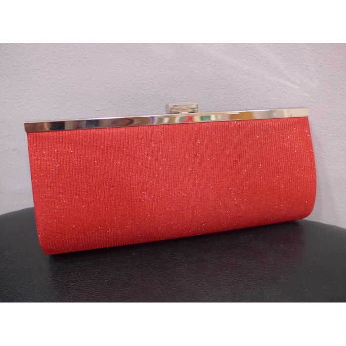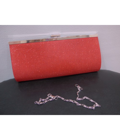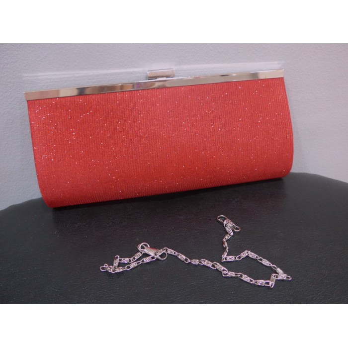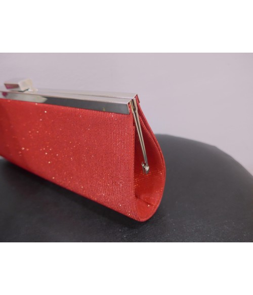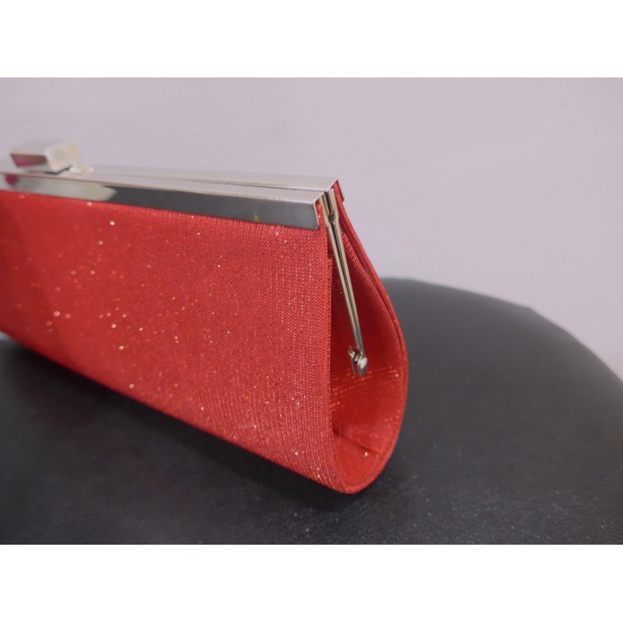 Bolso de mano rojo con brillos, bordes y cierre de metal plateado. Forro interior y con cadenita tono plata para colgar en el hombro.