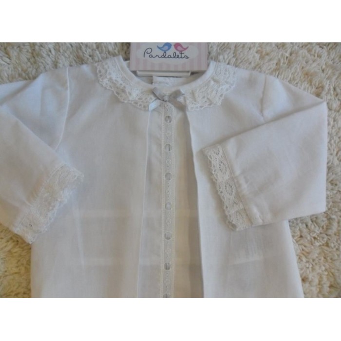 CAMISA BATISTA BLANCA CON PASACINTAS EN EL CENTRO GRIS. PUNTILLA EN CUELLO Y PUÑOS.