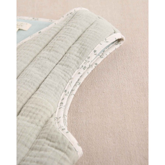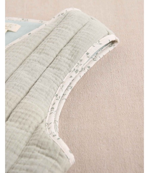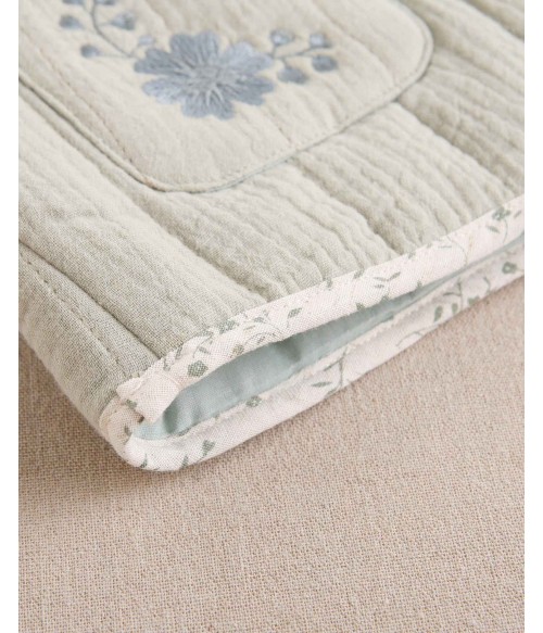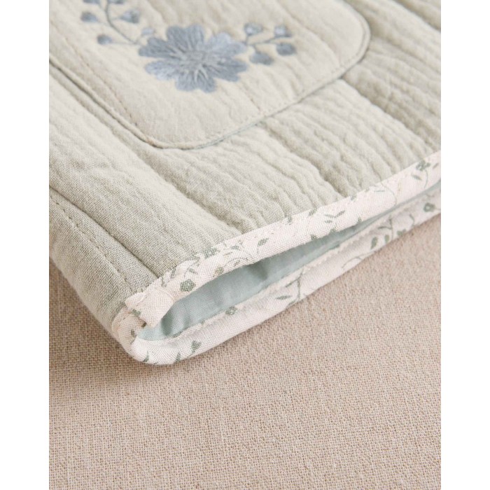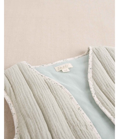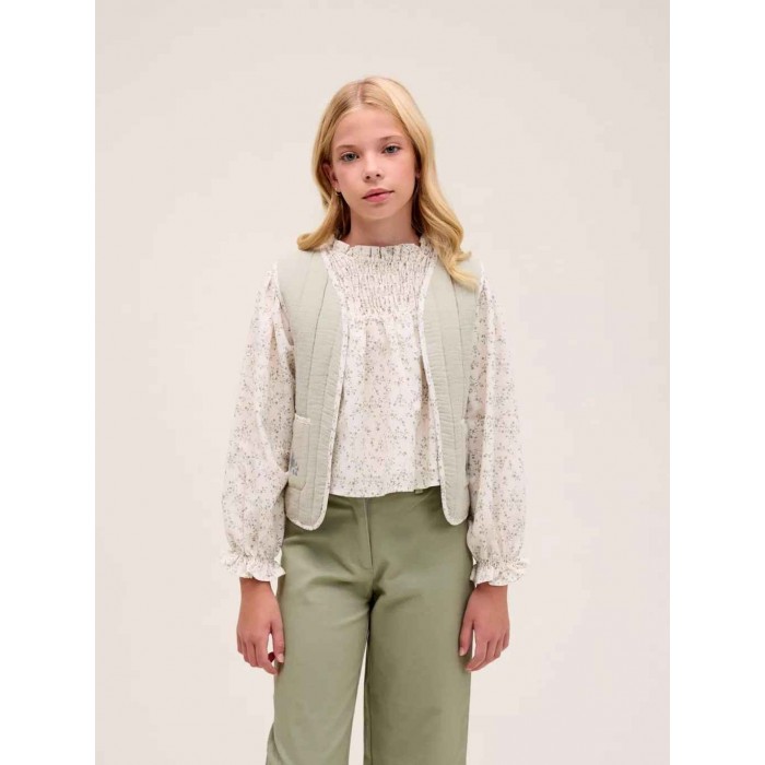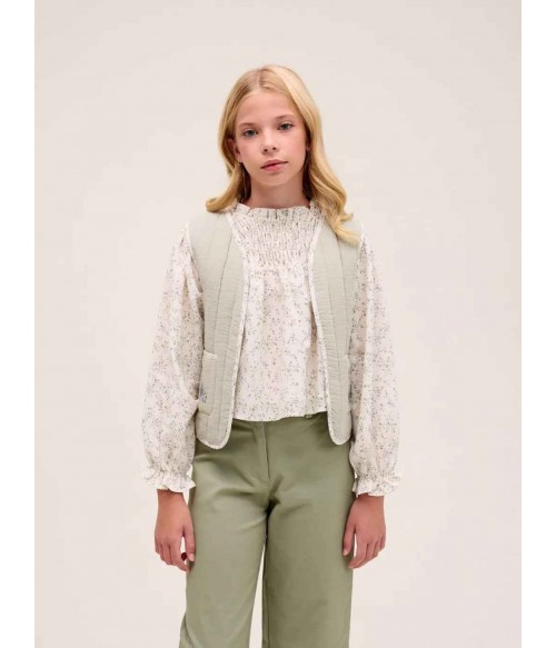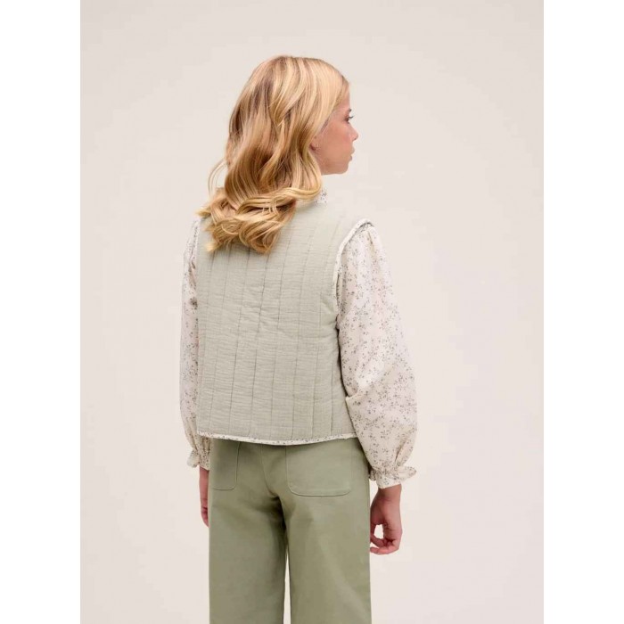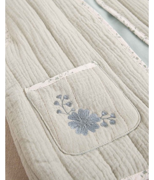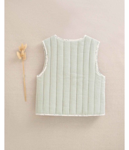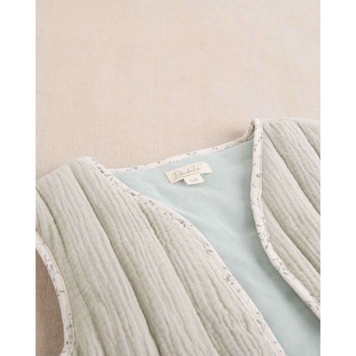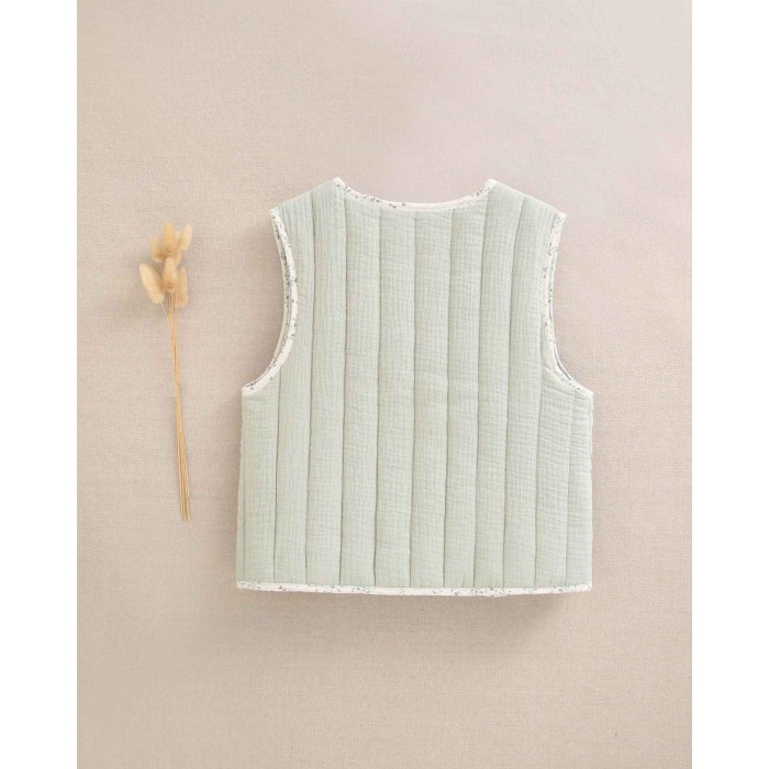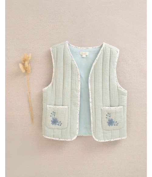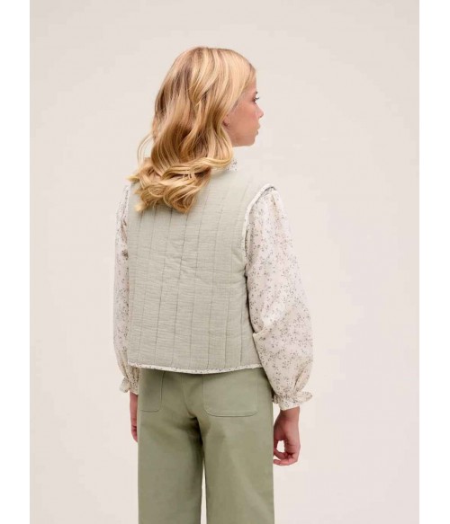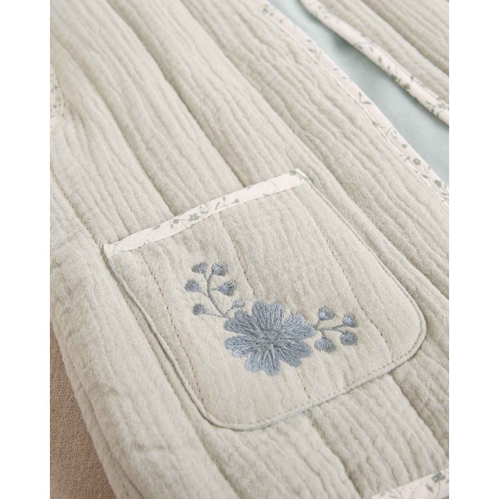 Chaleco verde acolchadito con bolsillos bordados con flores verdes.