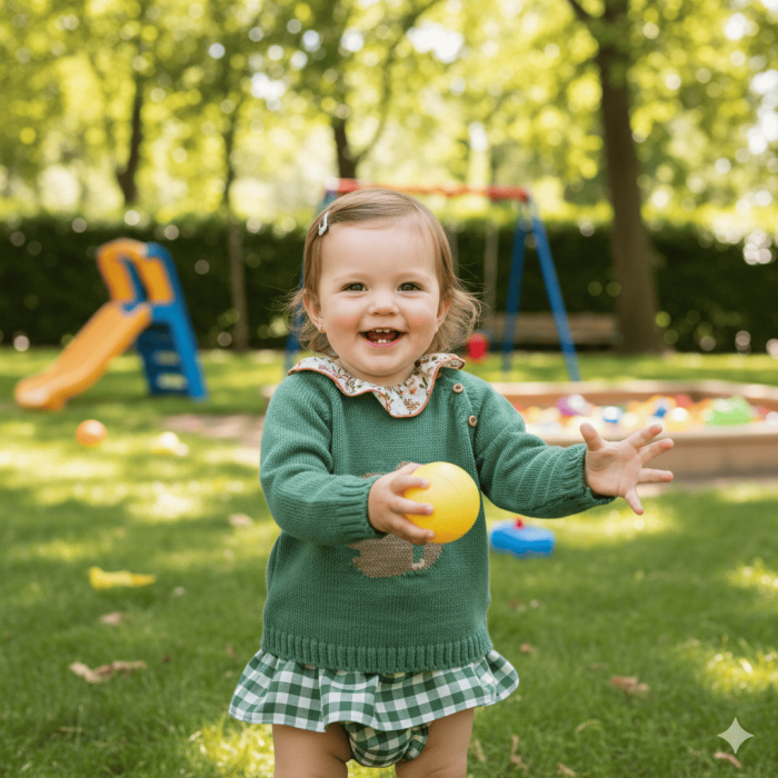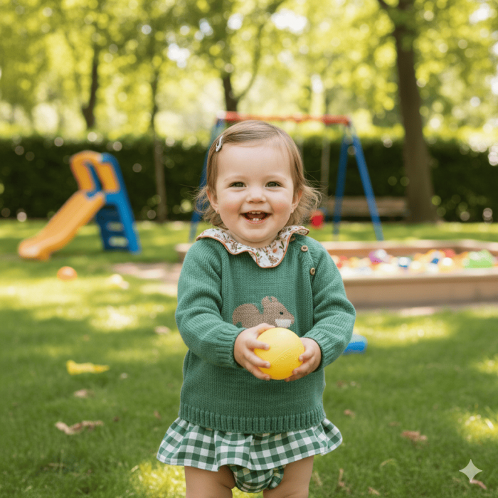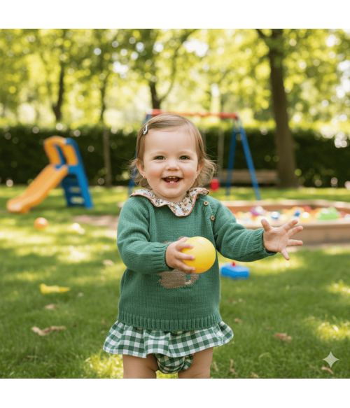 Conjunto de 3 piezas. Camisa de flores, jersey verde ardilla y culote con volante vichy verde.