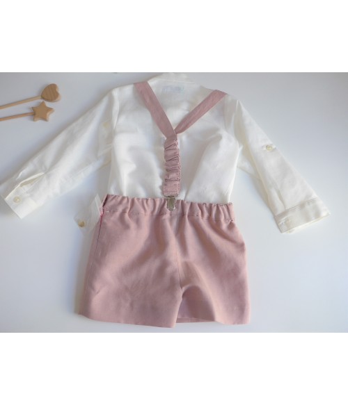 Conjunto camisa lisa de lino beig con cuello mao, short rosa empolvado, tirantes y pajarita rosa empolvado.