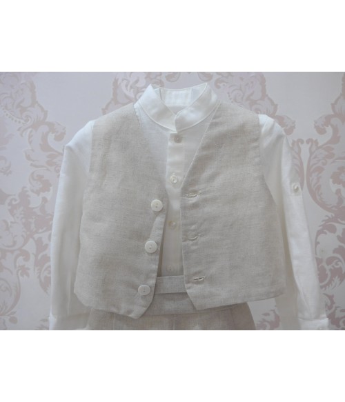Conjunto de lino compuesto por camisa cuello Mao cruda con lorzas, short beig con gomita trasera para mejor ajuste, fajín y chaleco a juego.