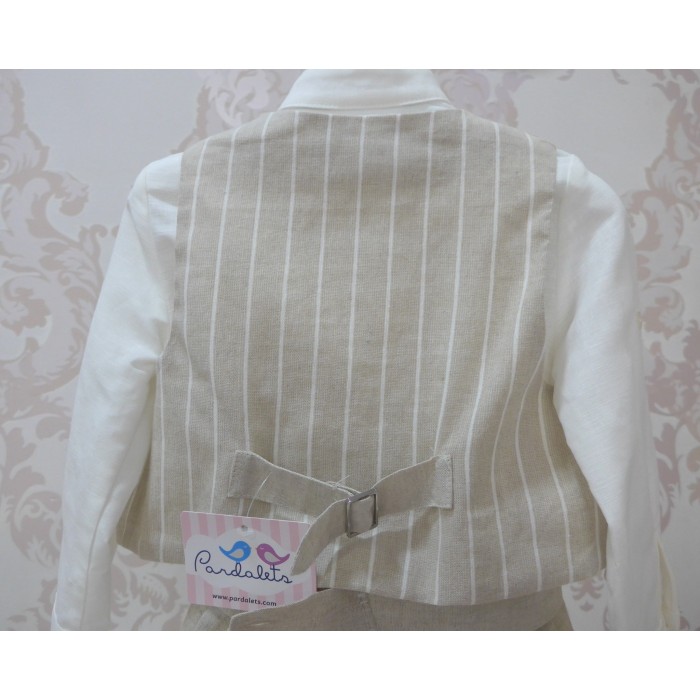 El chaleco es de color beig por la parte delantera y por la trasera es de rayas.