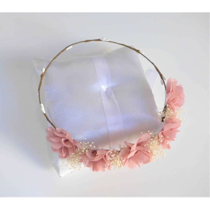 Corona de 5 flores de bambula rosa empolvado con paniculata beig.