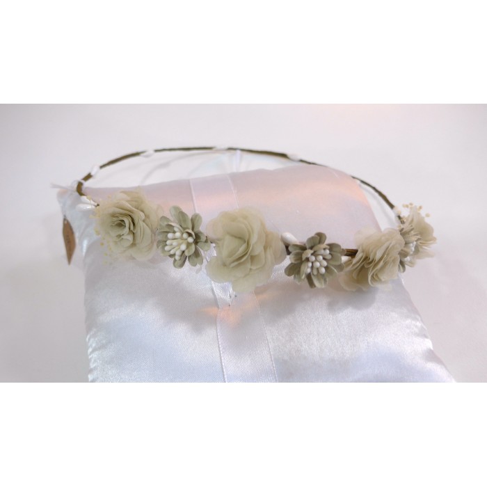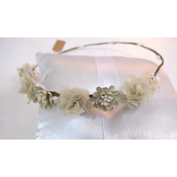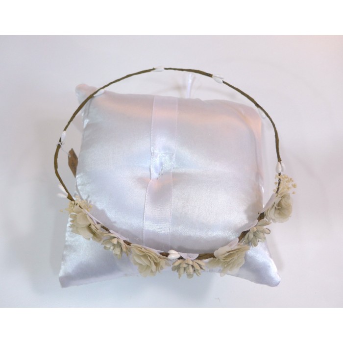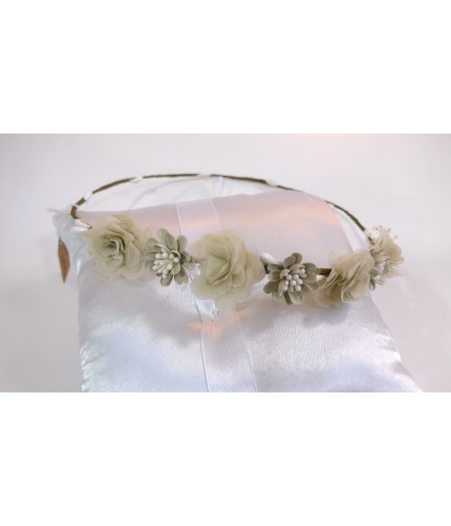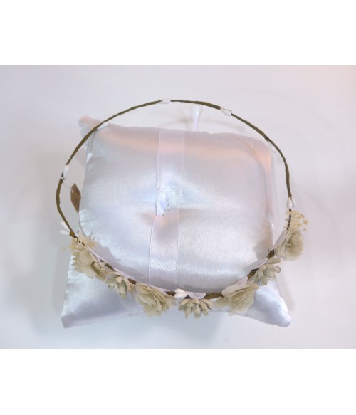 Corona con flores de bambula color tostado y paniculata beig en los extremos.