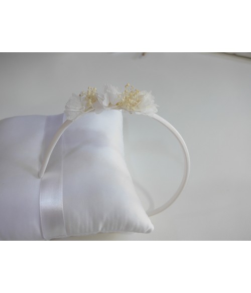 Diadema blanca de bámbula con tres florecitas y paniculata beig.