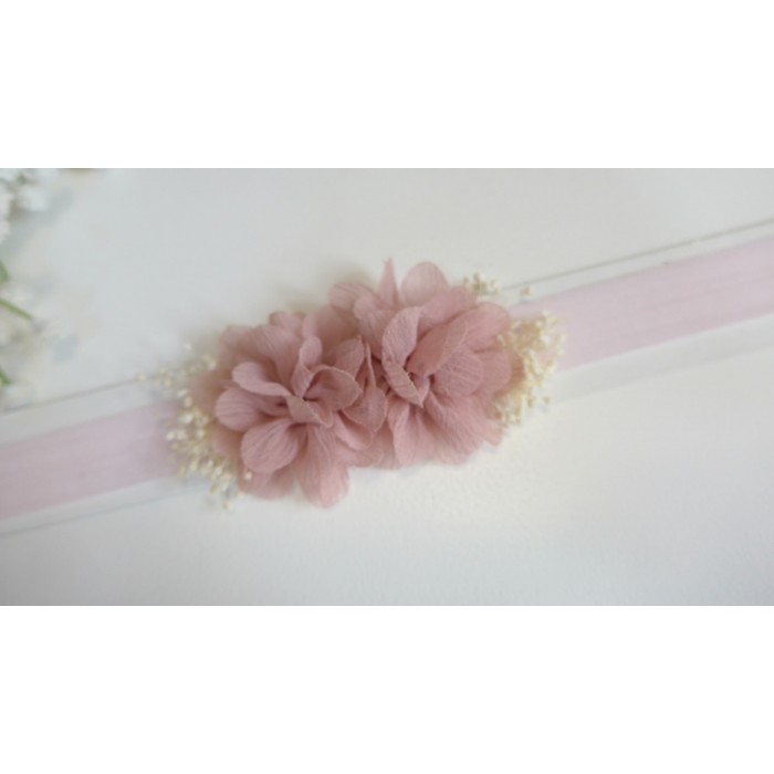 Diadema elástico rosa empolvado con dos flores rosas y paniculata beig.