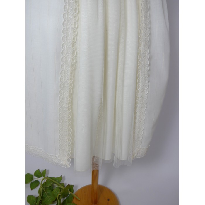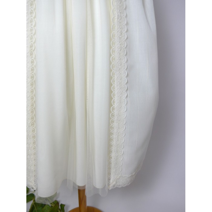 Faldon sin mangas con tul beig, cuerpo con puntillas y dos lazitos beig.
