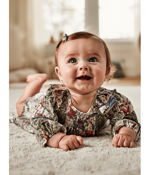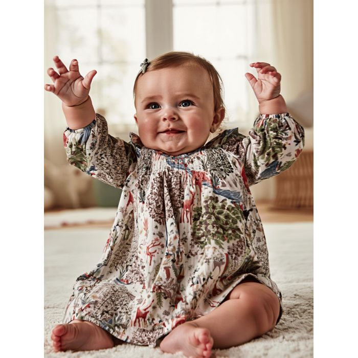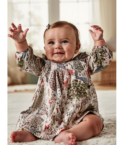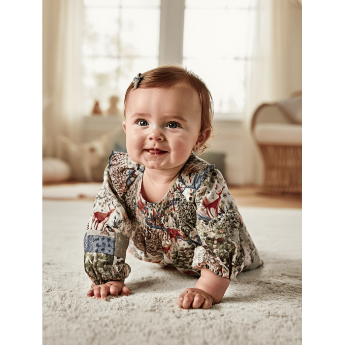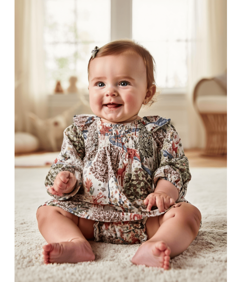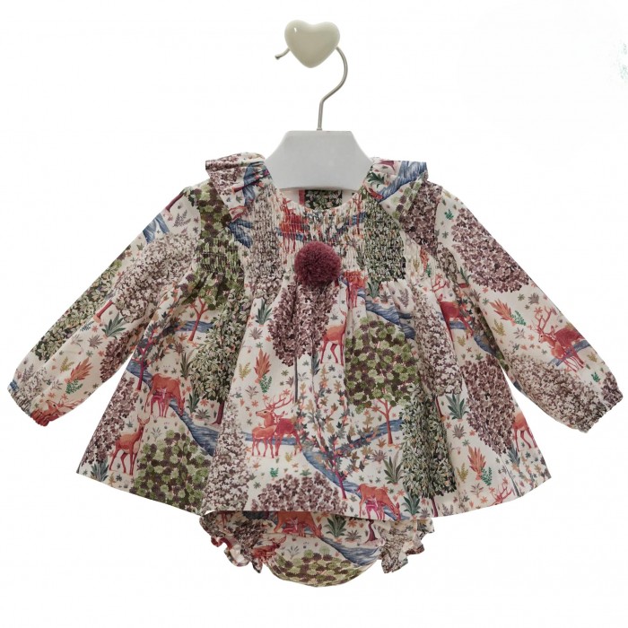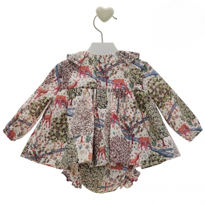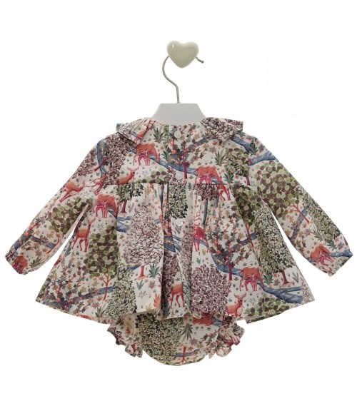 Jesusito con divertido estampado de bosque y ciervos en tonos verdes y buganvilla.