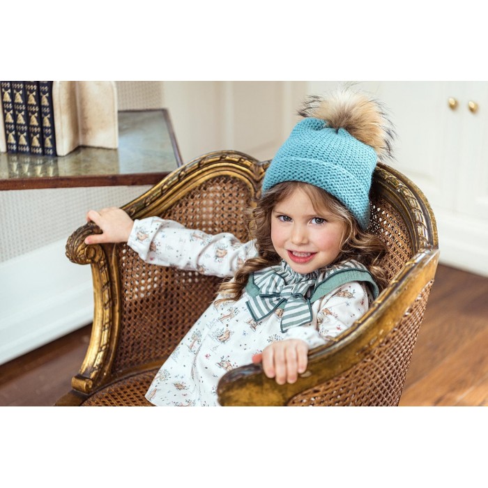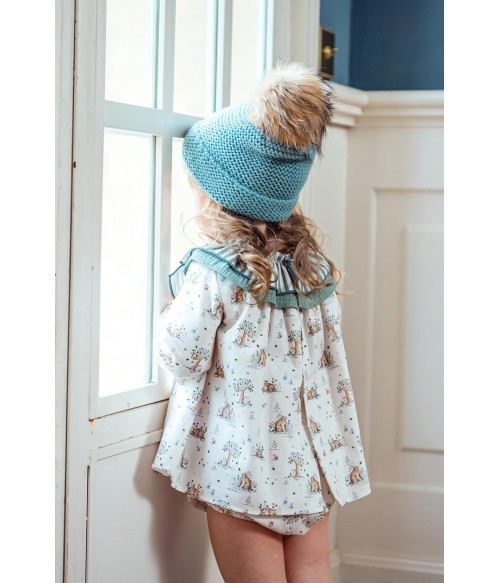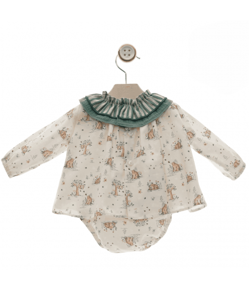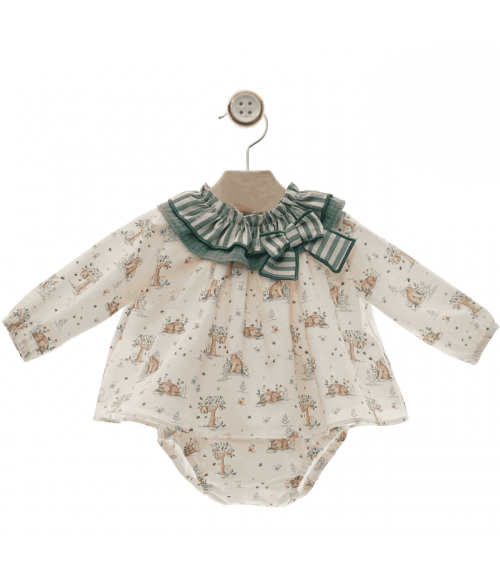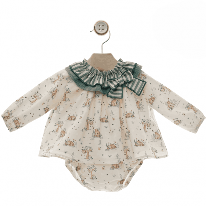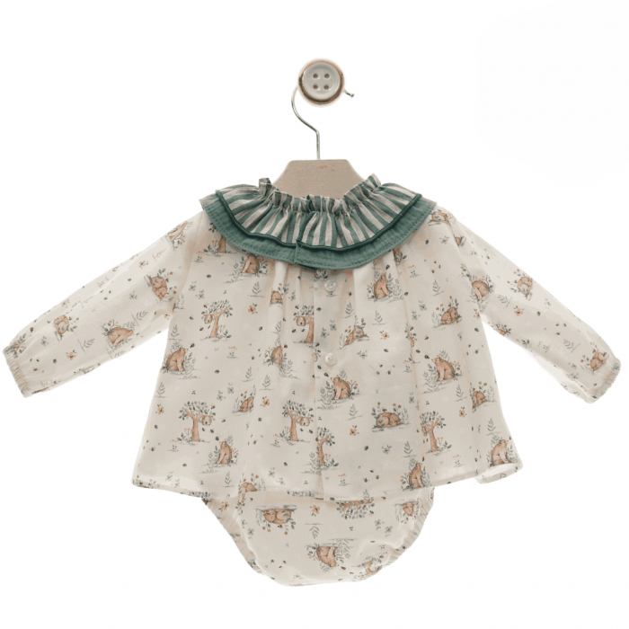 Jesusito fondo beig con estampado de ositos y panales de abeja.