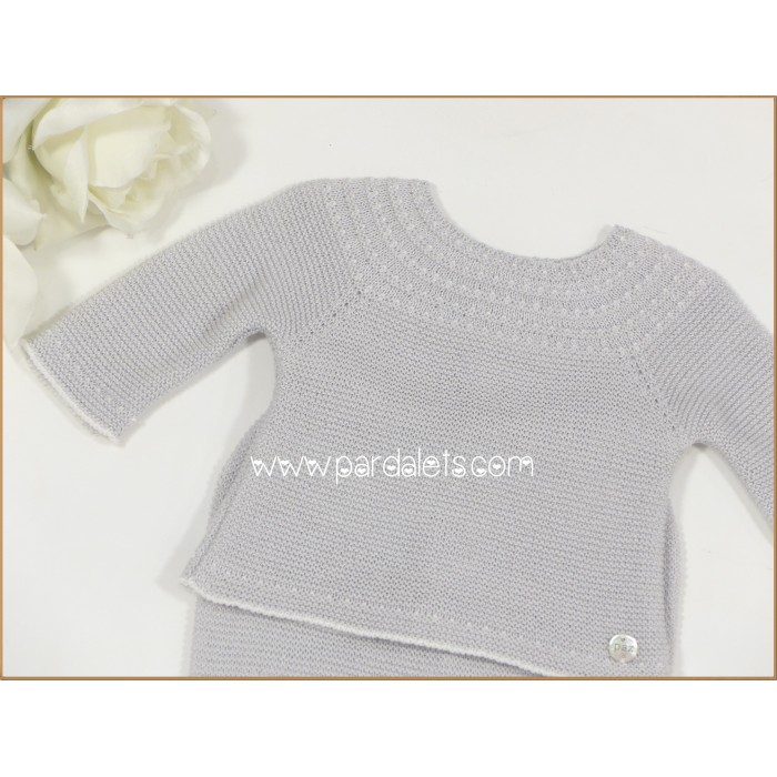 Jubón y polaina gris con topitos blancos en el canesú y ribete blanco en el bajo y las mangas.