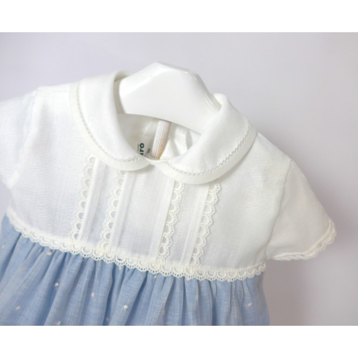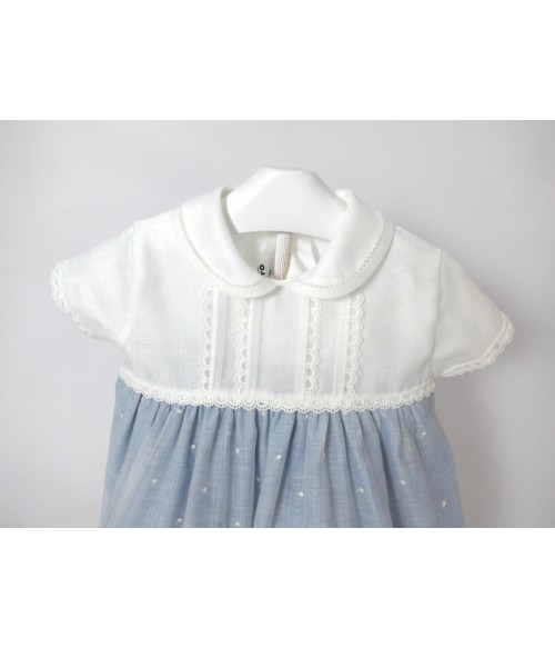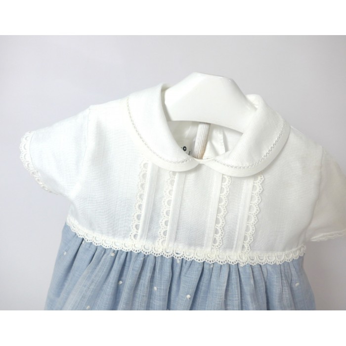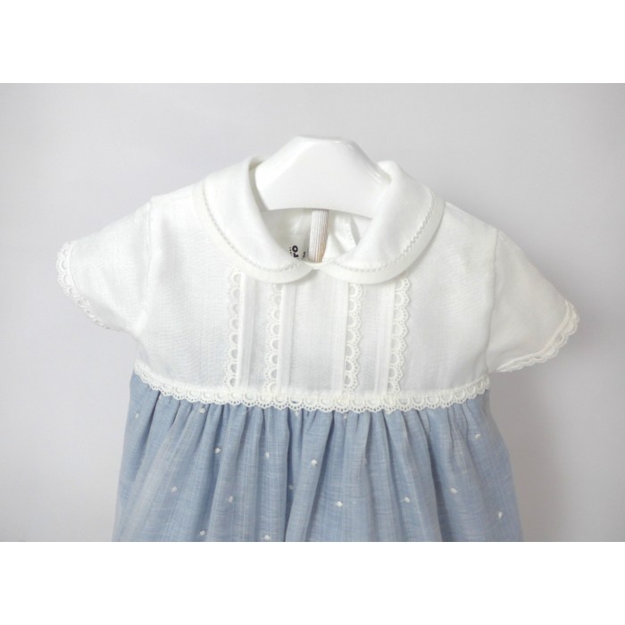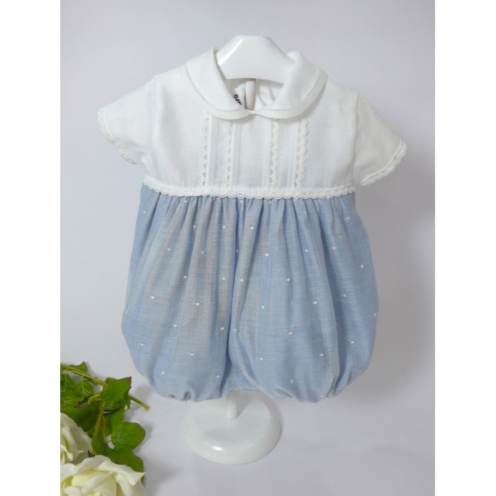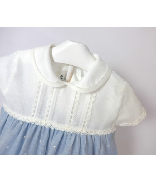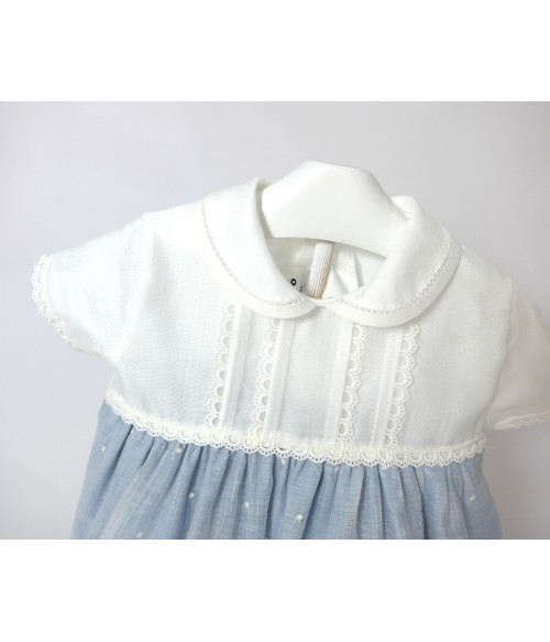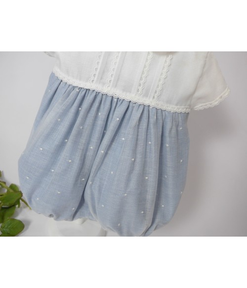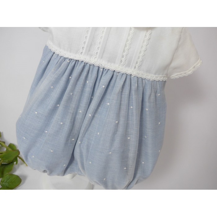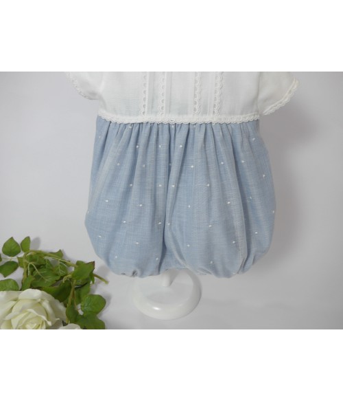 Pelele de batista inglesa con el cuerpo blanco de manga corta con detalles blancos y cuello bebe con vainica hecha a mano.