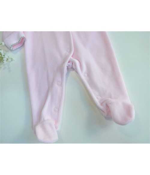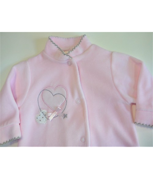 Pijama terciopelo rosa bebé con ribete en gris y bordados corazones.