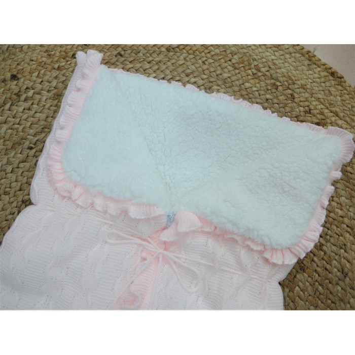 Saco de lana rosa bebe con cordón en la parte superior y pompones. Punto vertical, adorno en los bordes y en la cremallera central.