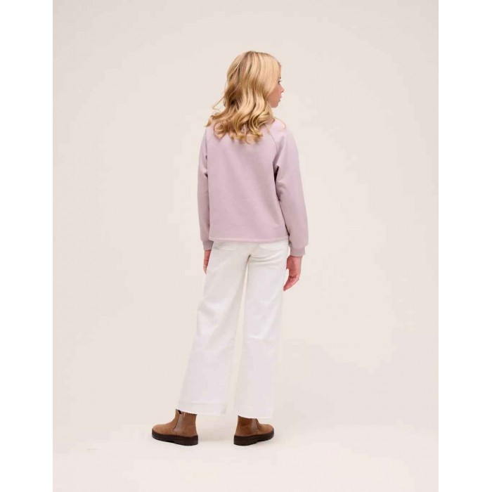 Sudadera malva con detalle de blonda en el cuello blanco.