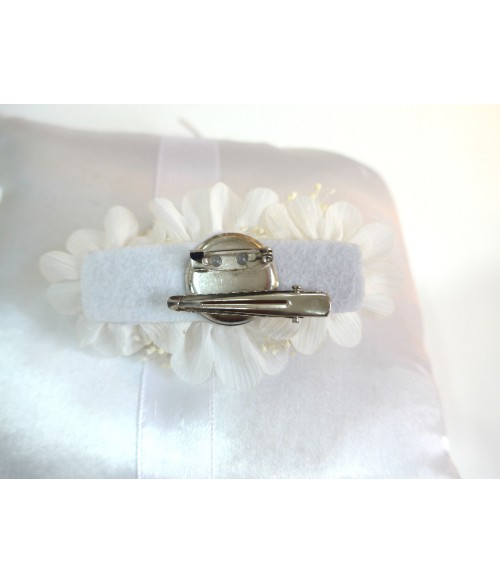 Lleva doble enganche, pinza pico para el pelo e imperdible para el fajín del vestido.