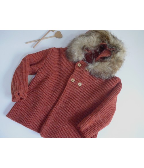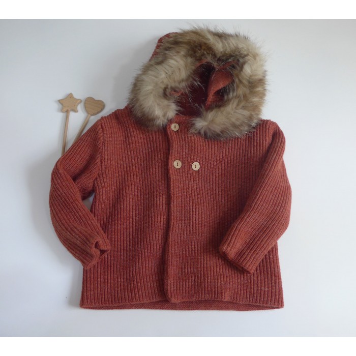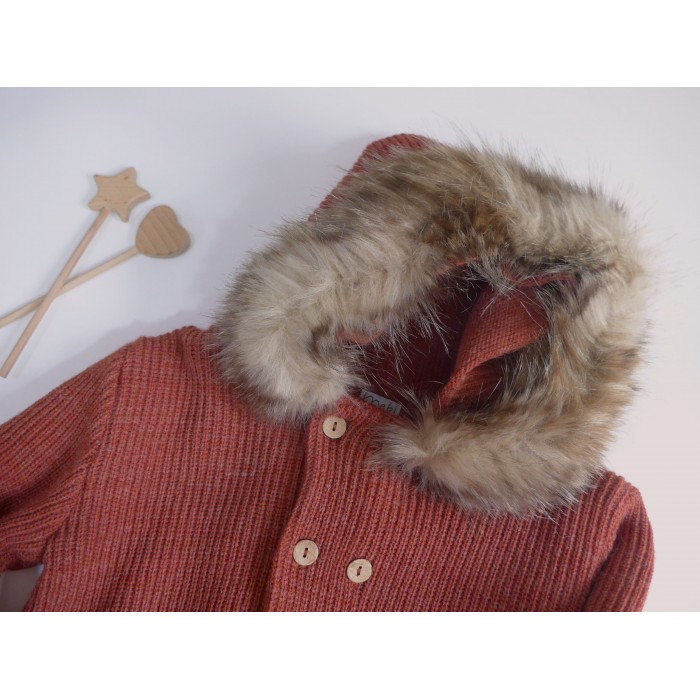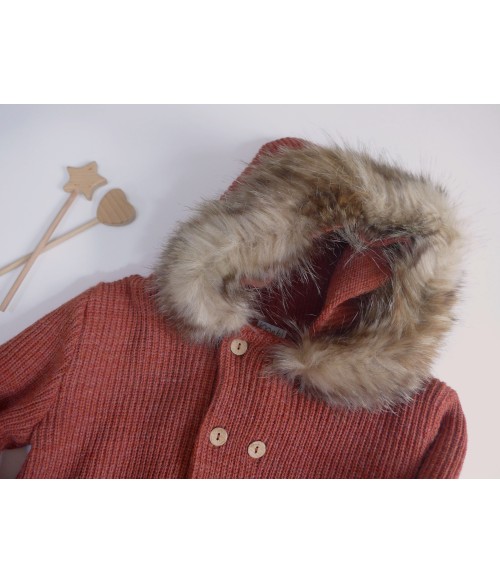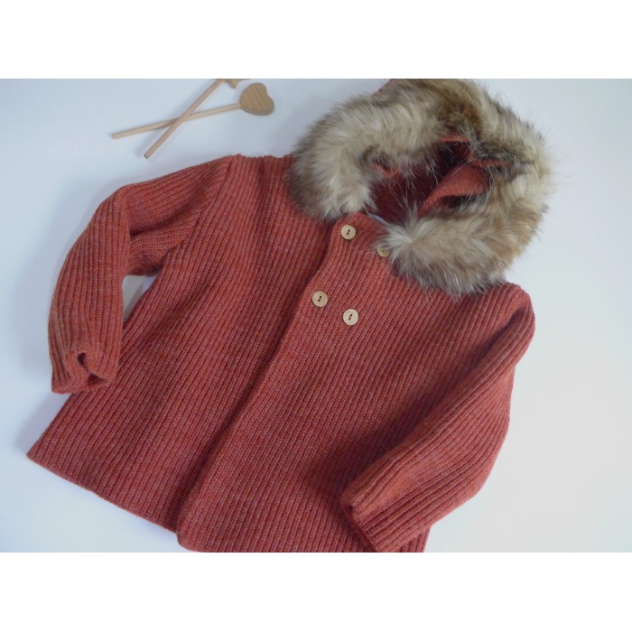 Trenka de doble punto color teja con capucha y pelo sintetico de quita y pon.