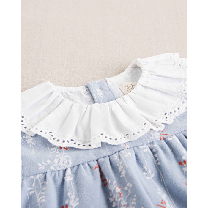 Vestido azul con estampado ramitas blancas y naranjas.