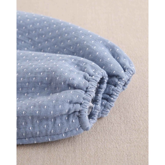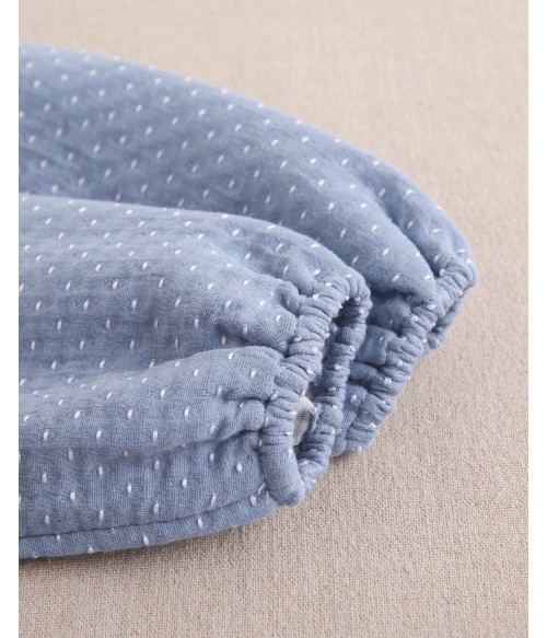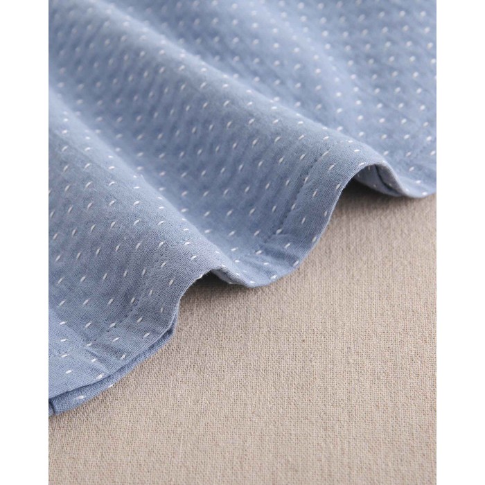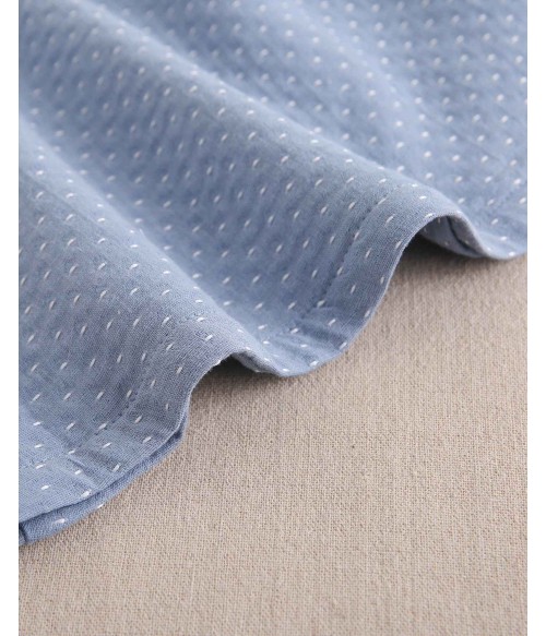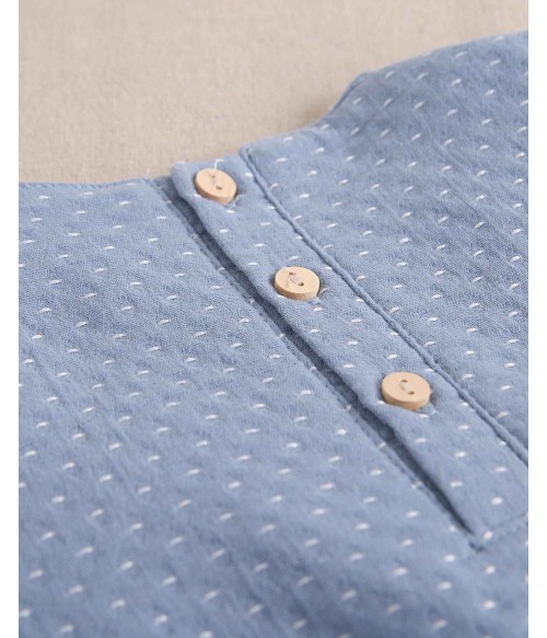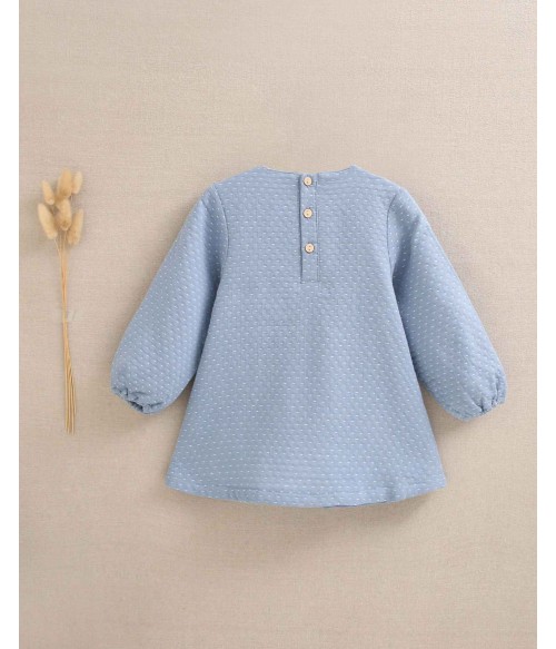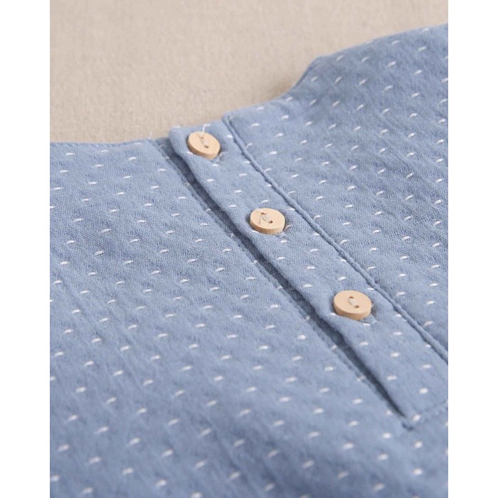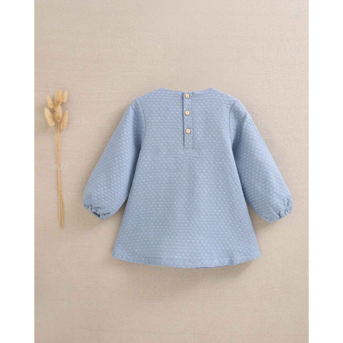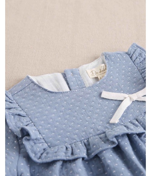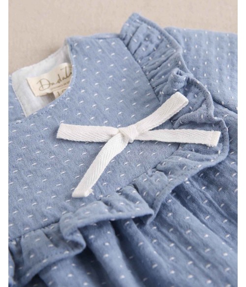 Vestido azul empolvado con puntitos blancos.
