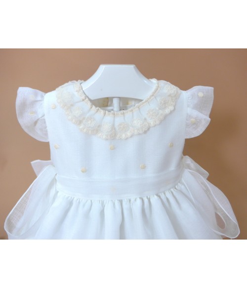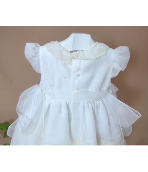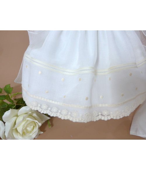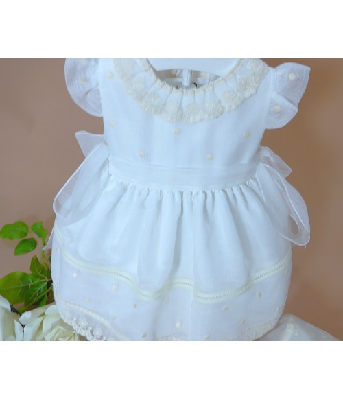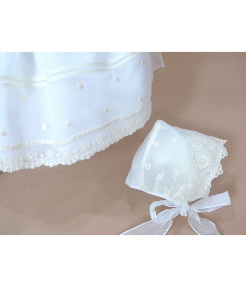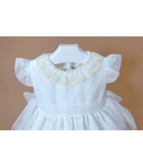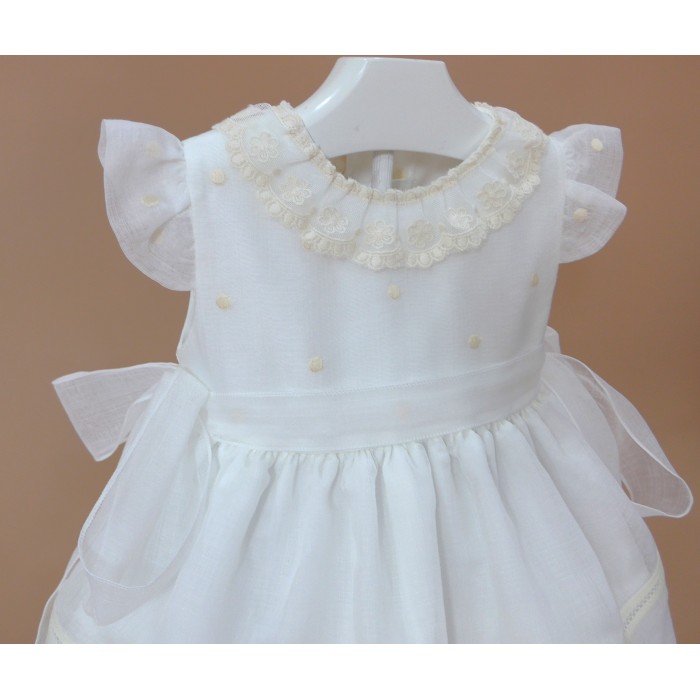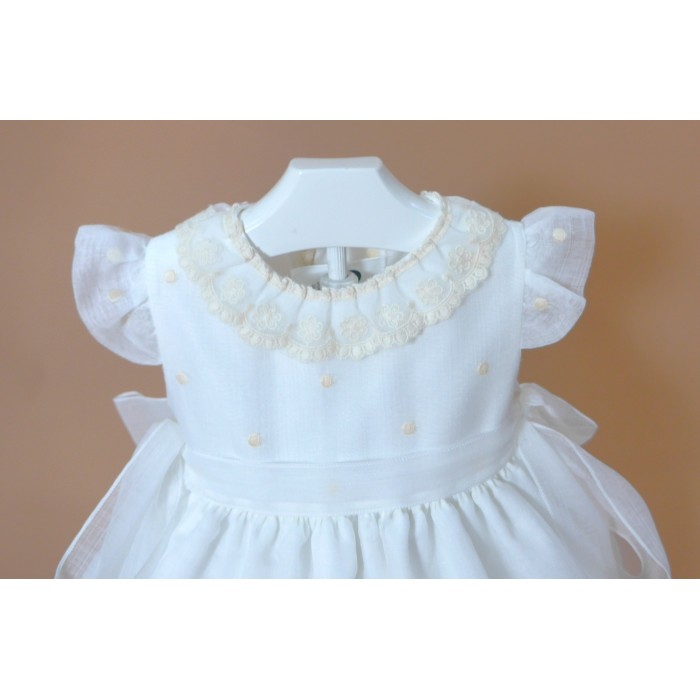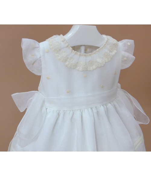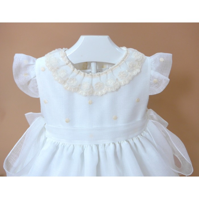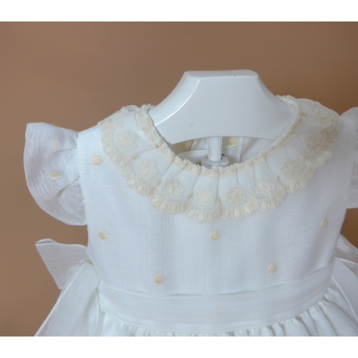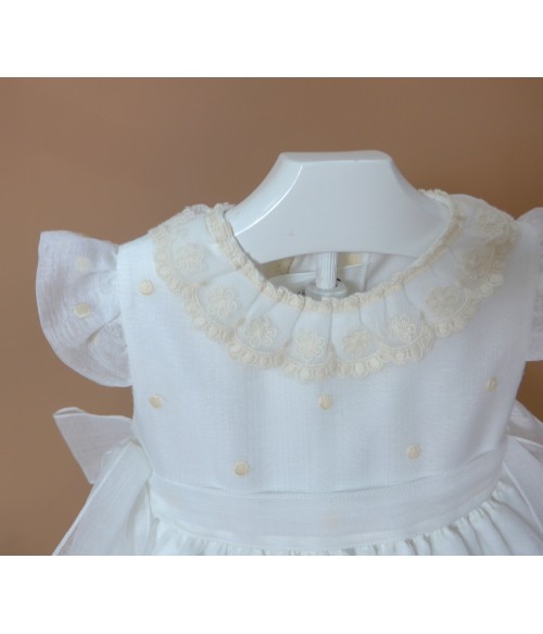 Vestido de batista inglesa con topos bordados y cuello puntilla bordada.