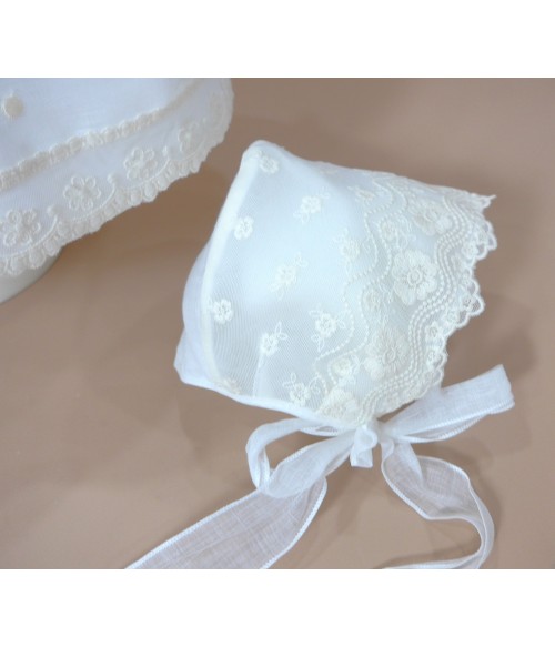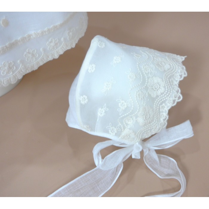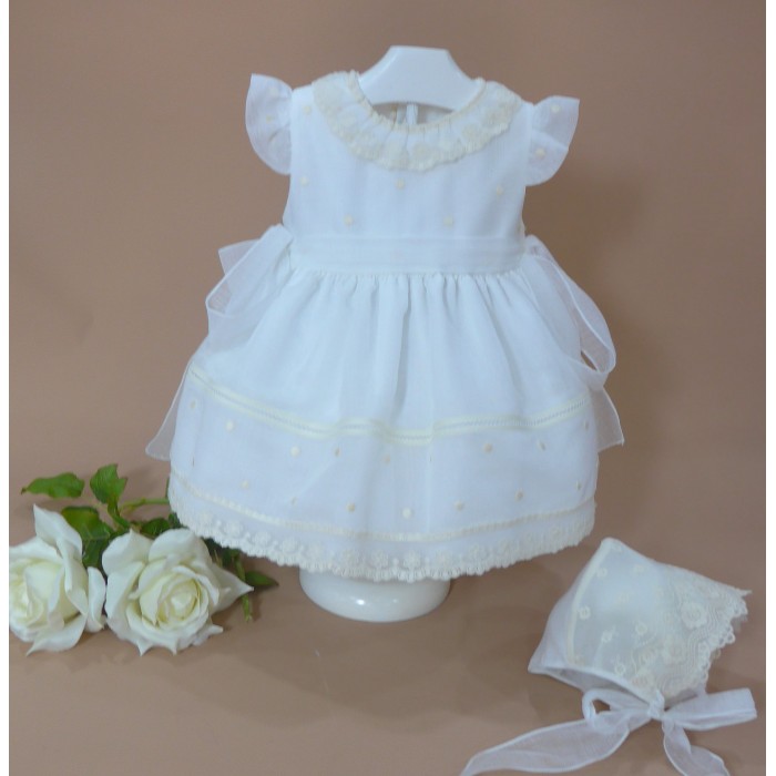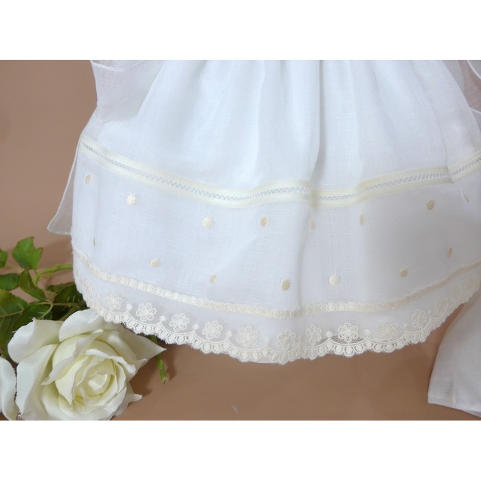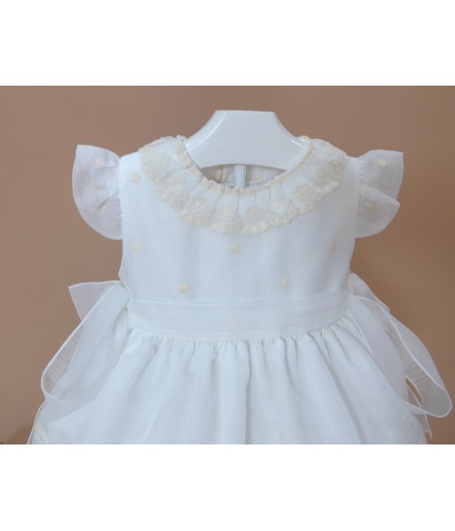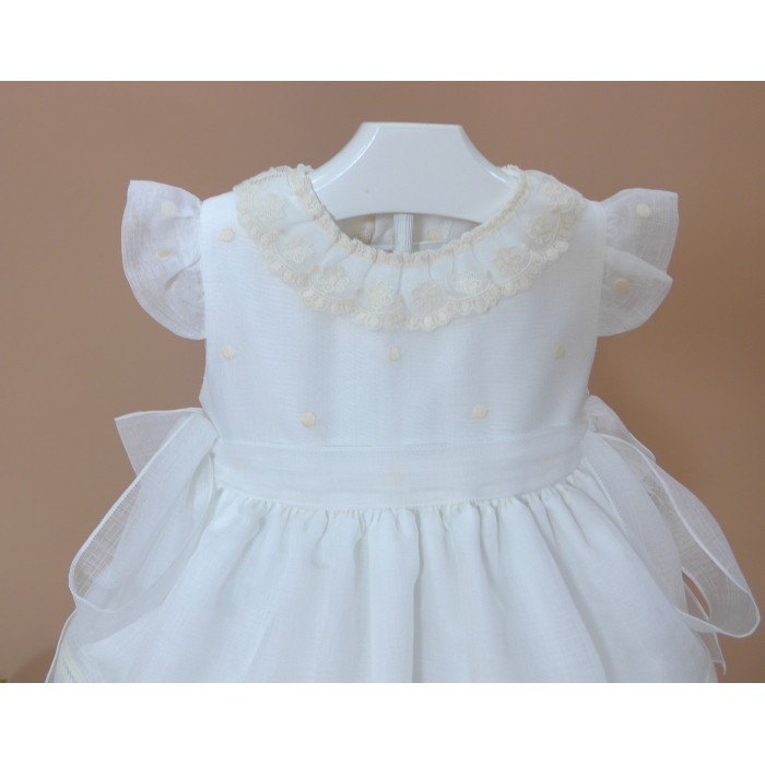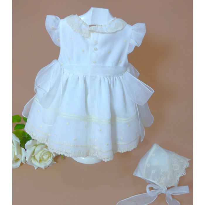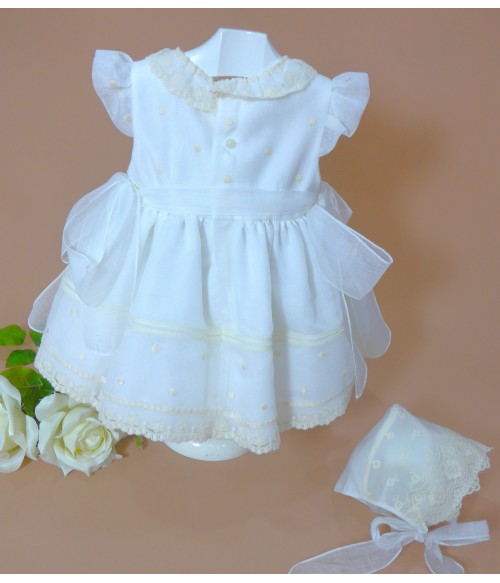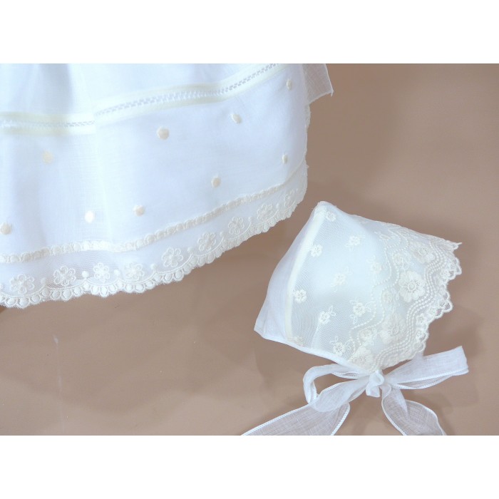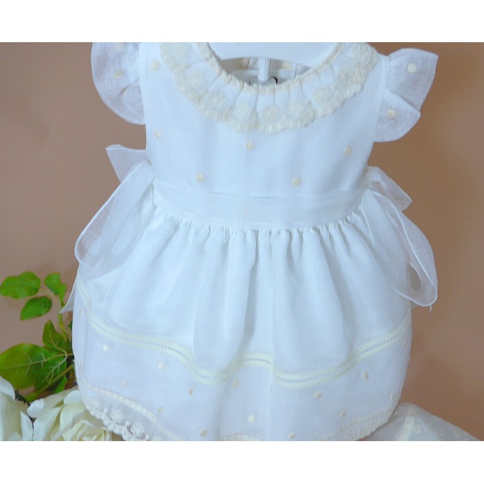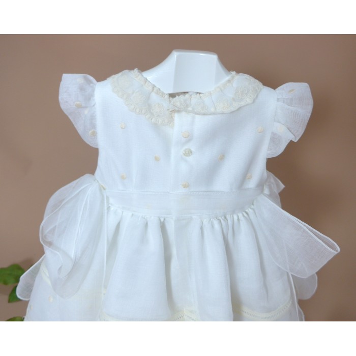 Vestido de batista inglesa con topos bordados y cuello puntilla bordada.