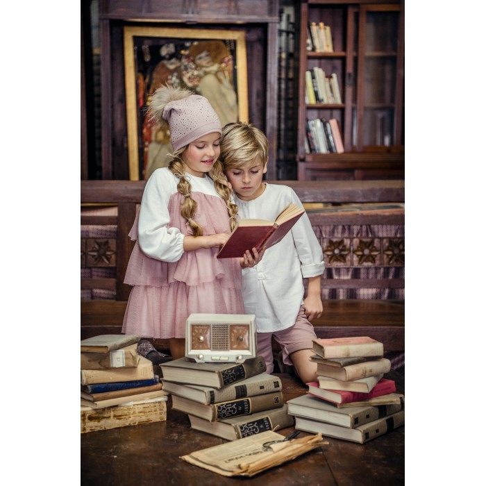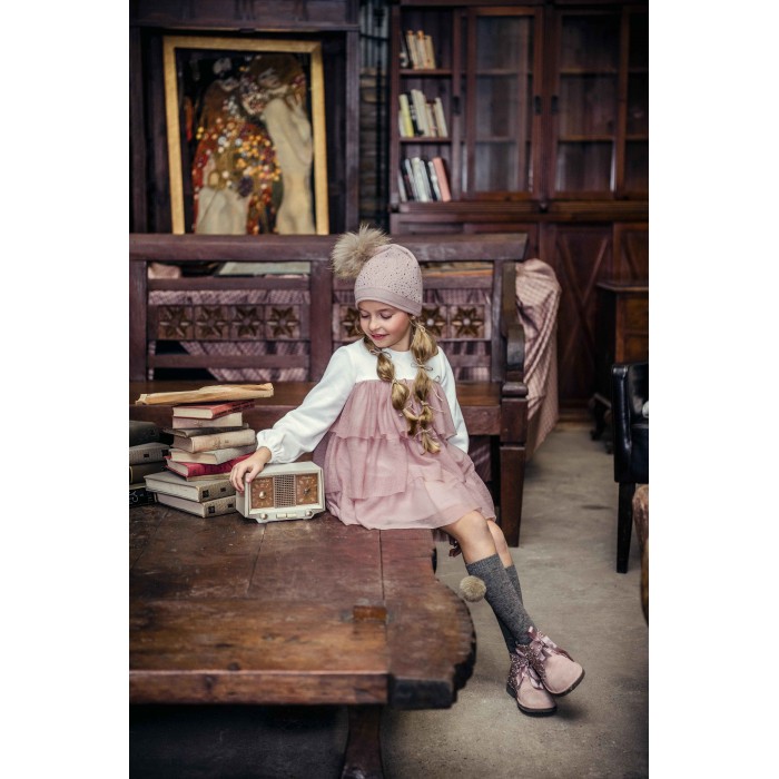 Vestido con el cuerpo de punto beig con estampado de estrellas doradas y gomita en el puño.