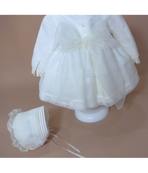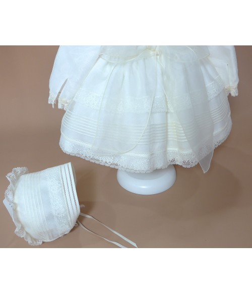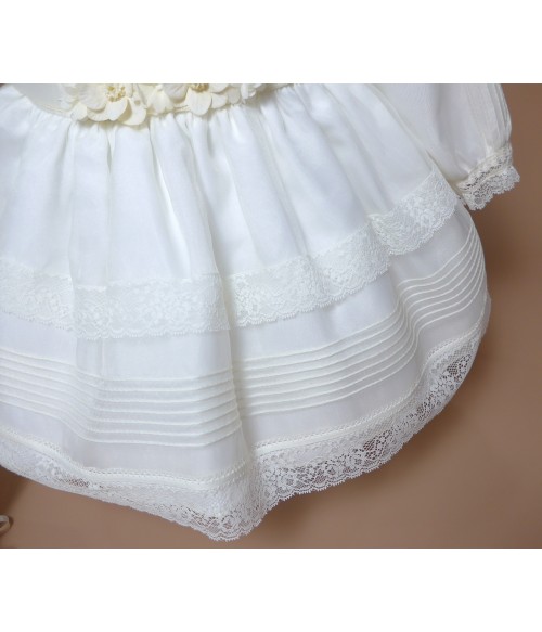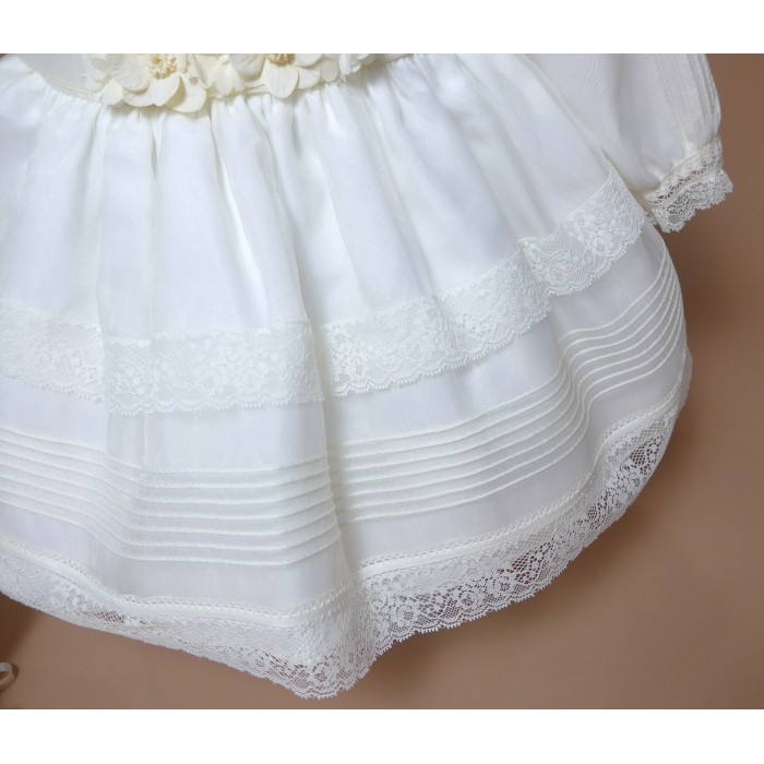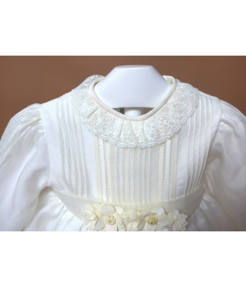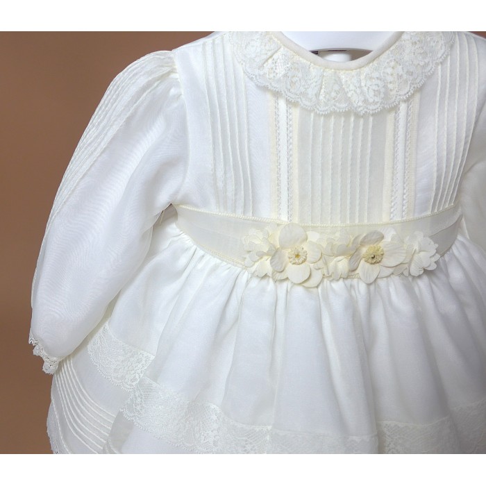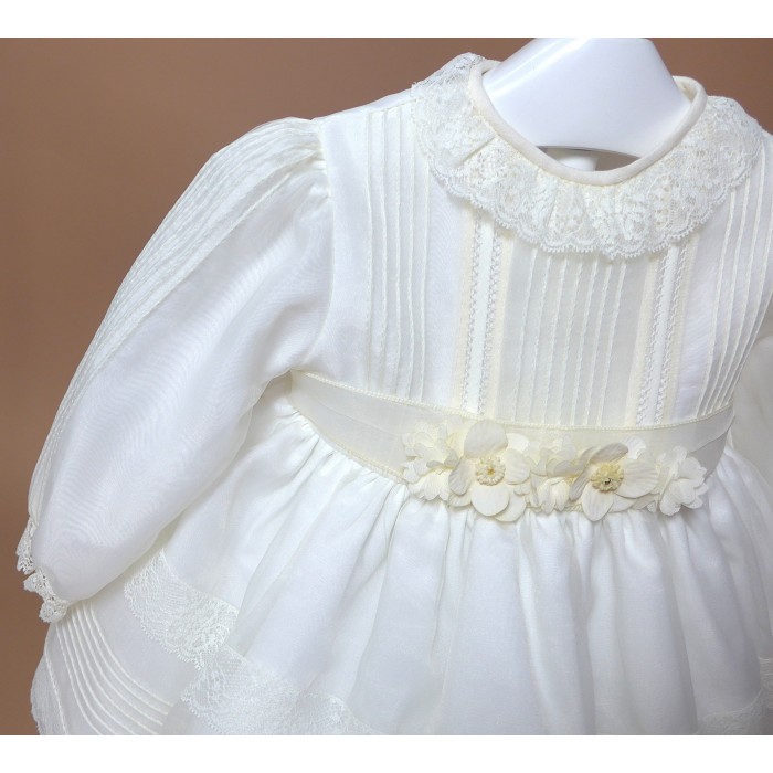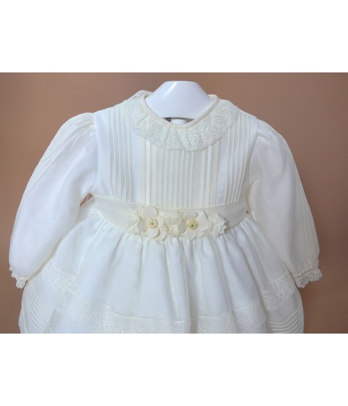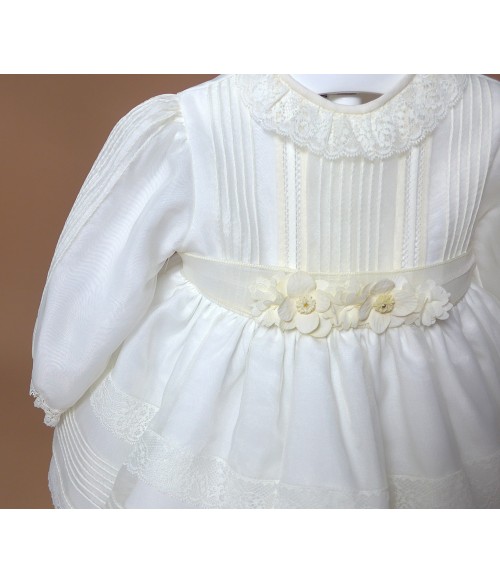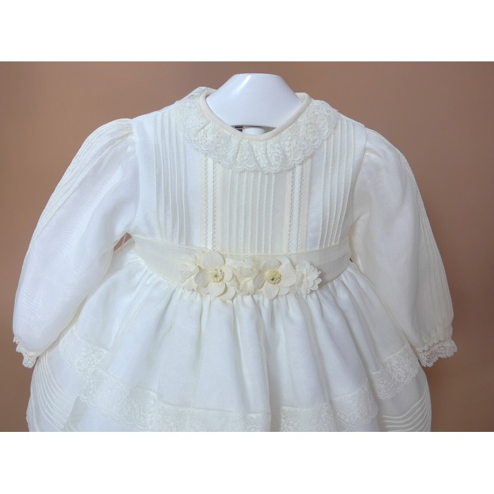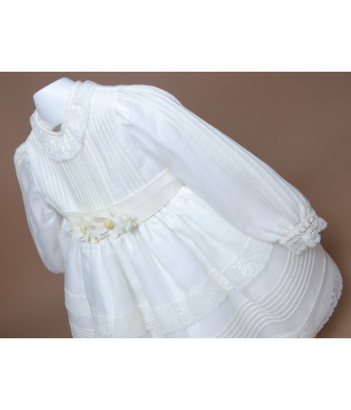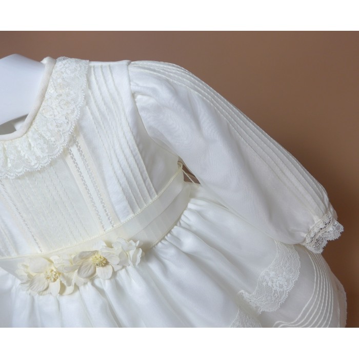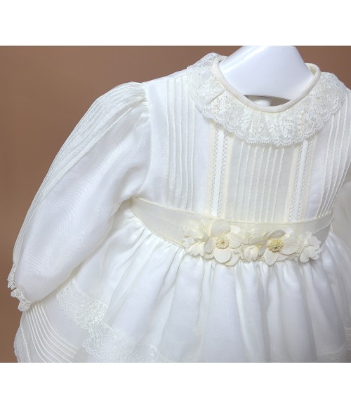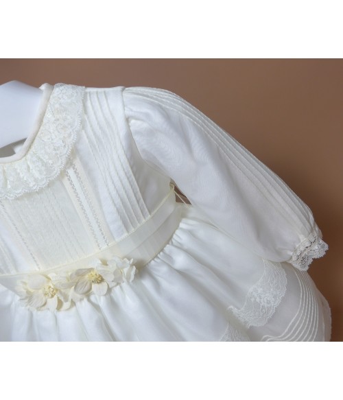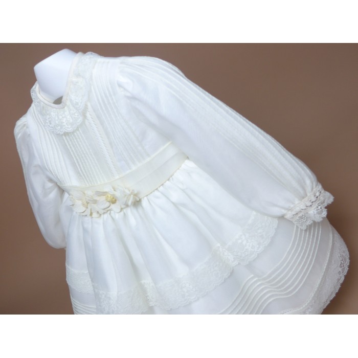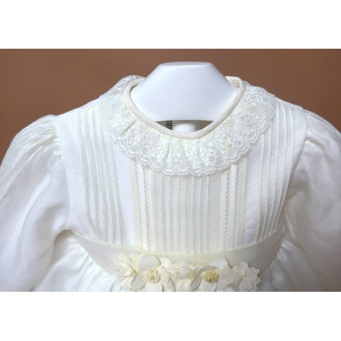 Vestido de organza beig con manguita larga, cuello volante de puntilla y vainicas en el delantero.