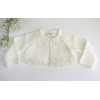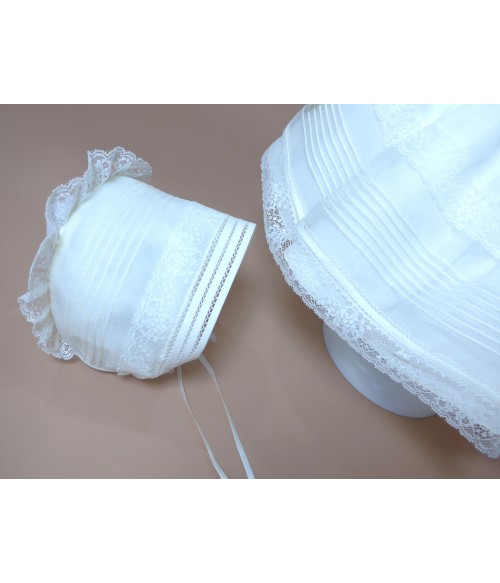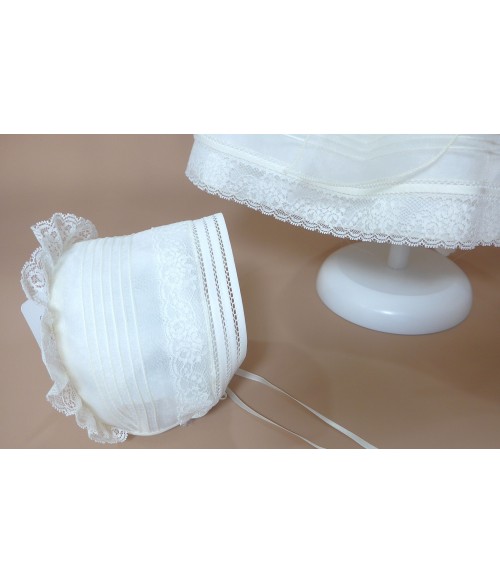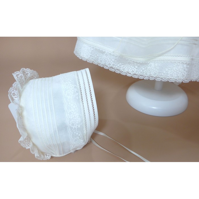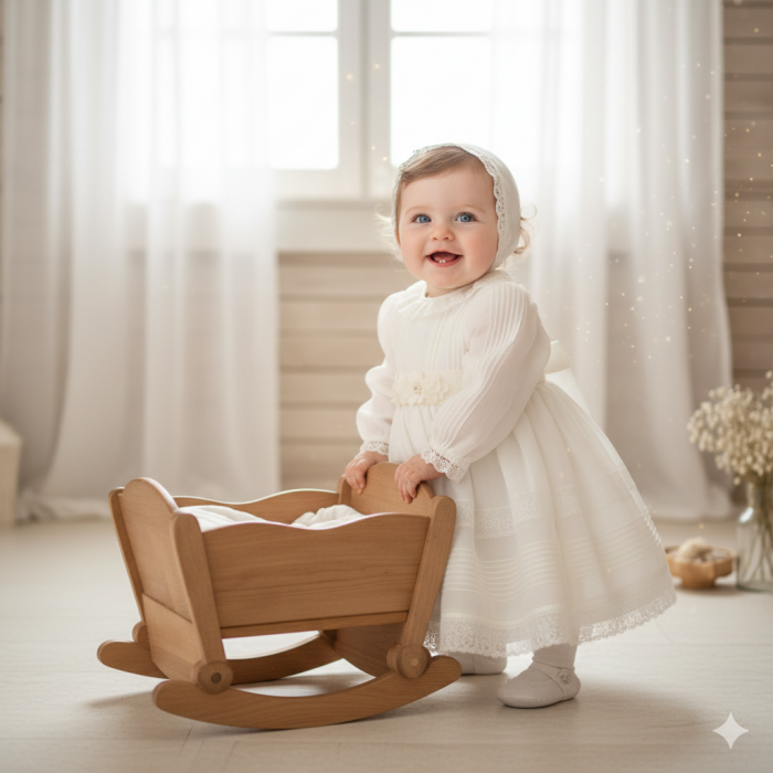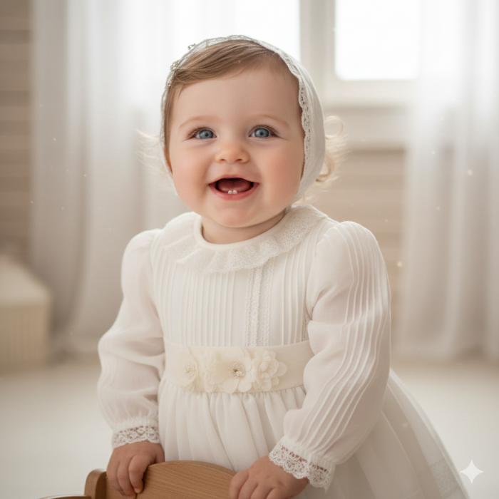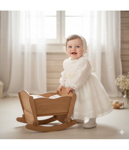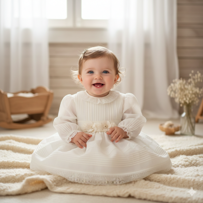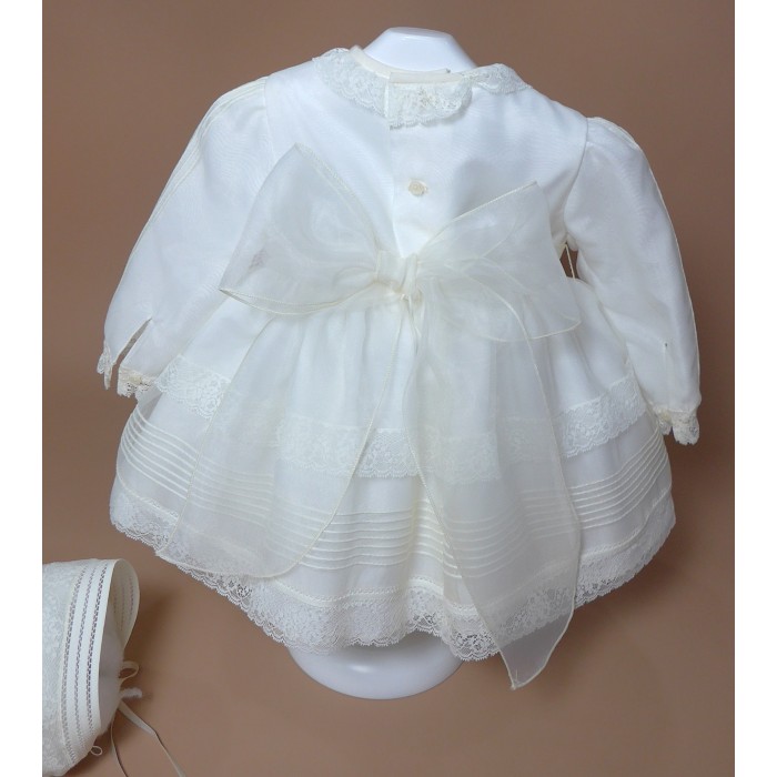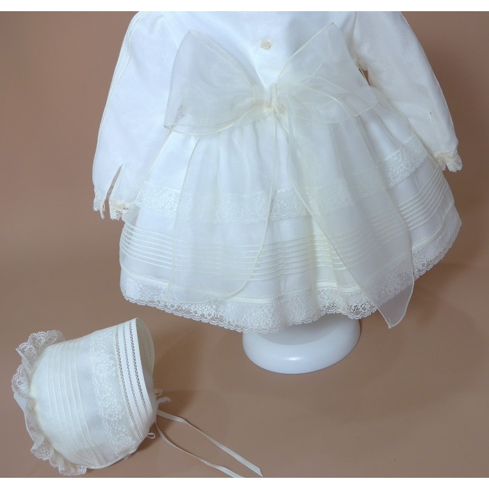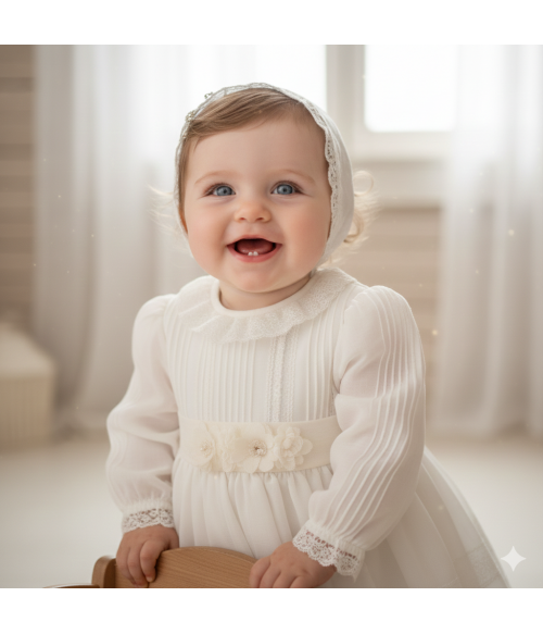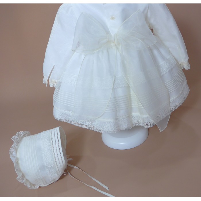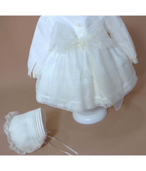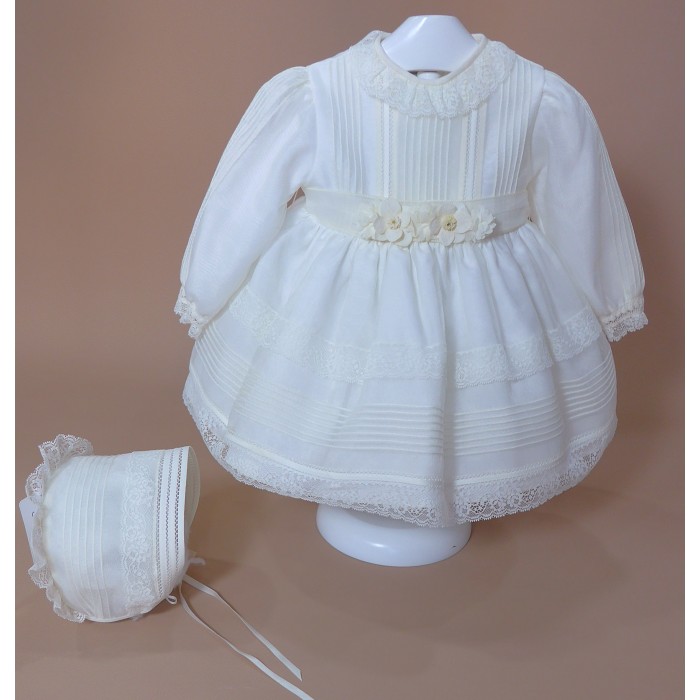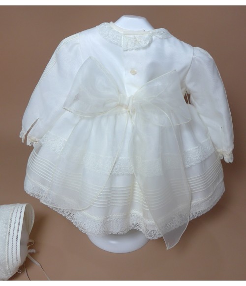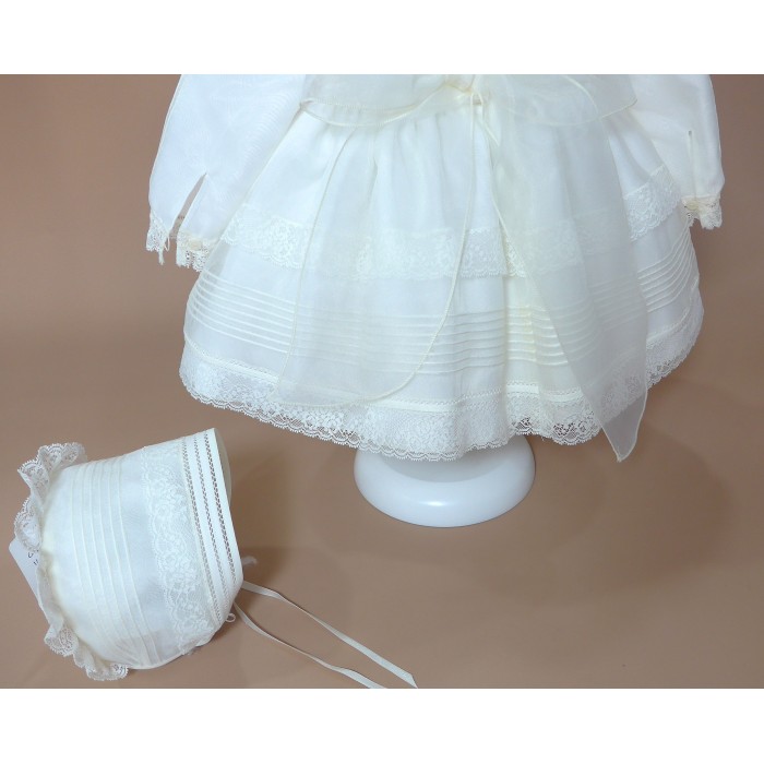 Vestido de organza beig con manguita larga, cuello volante de puntilla y vainicas en el delantero.