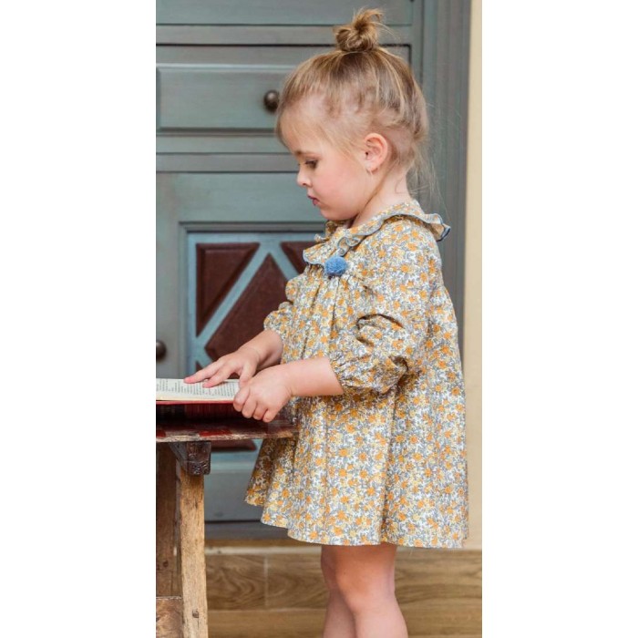 Vestido con braguita de estampado liberty de flores turquesas y mostaza.