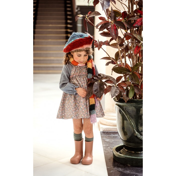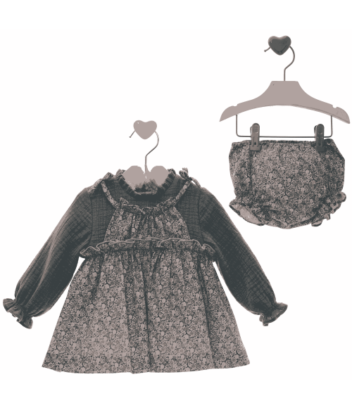 Vestido imitando pichi con florecitas rosas y blusa turquesa.