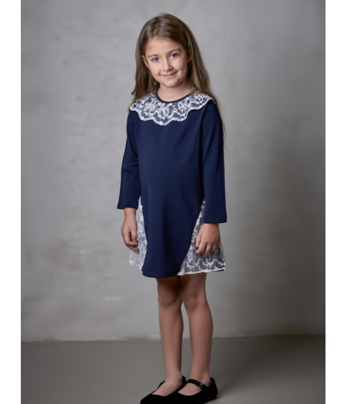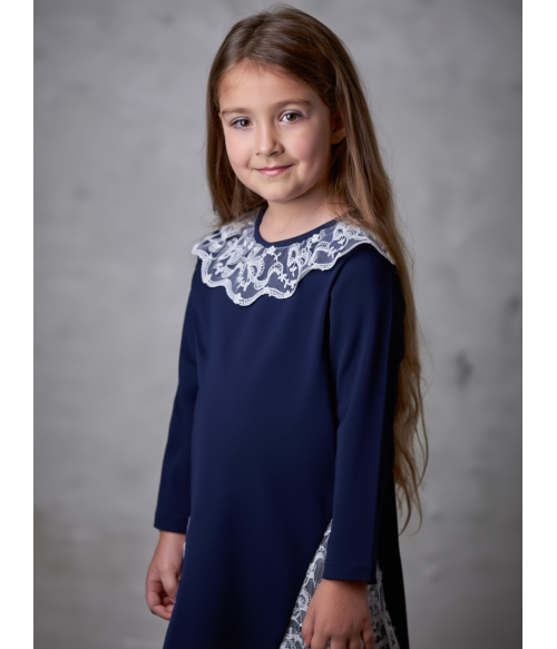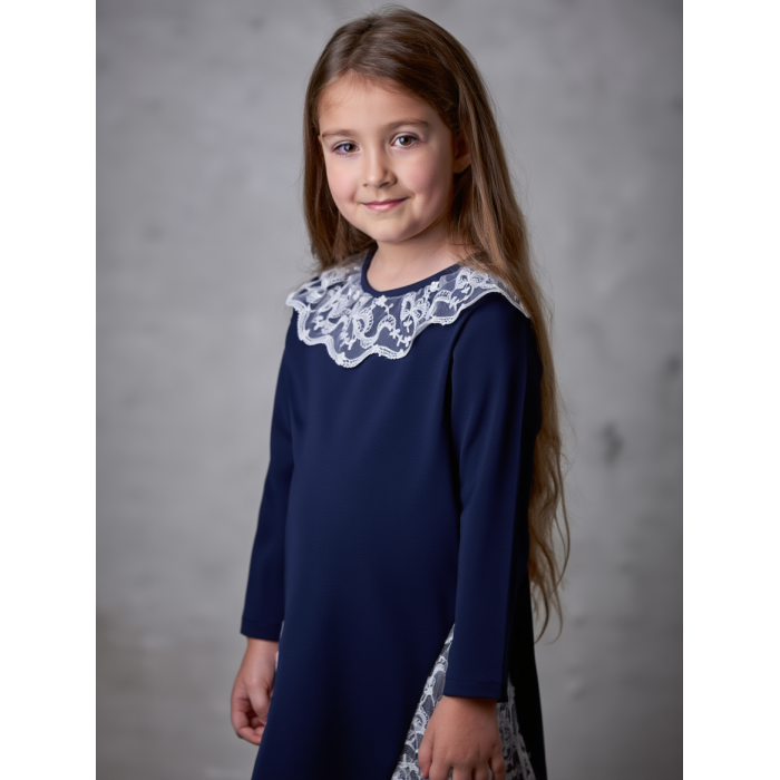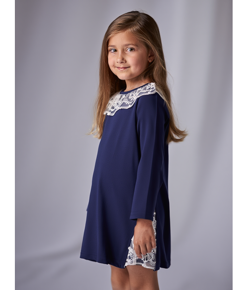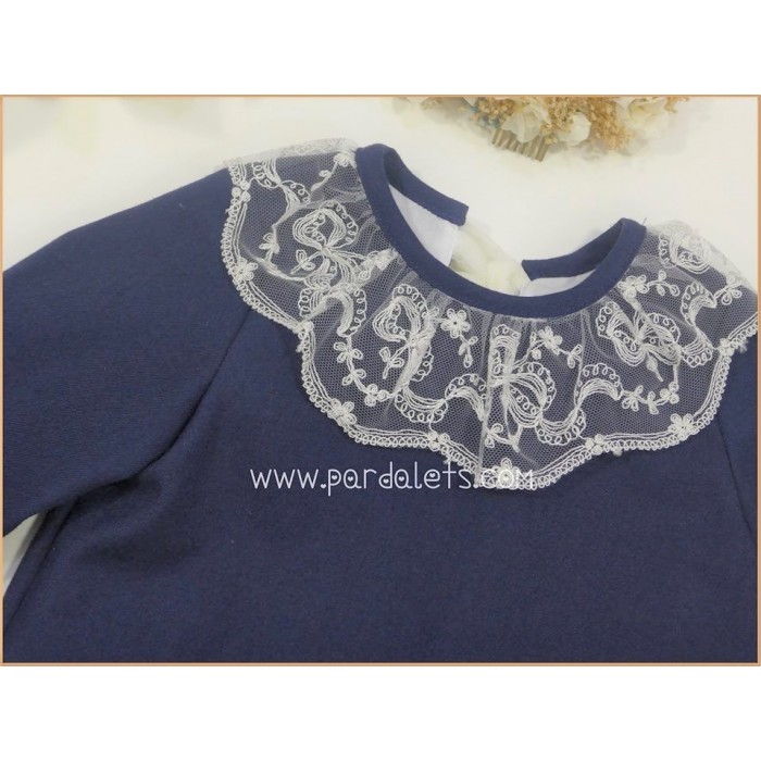 Vestido manga larga azul marino, cuello volante tul bordado blanco a juego con los laterales del vestido.