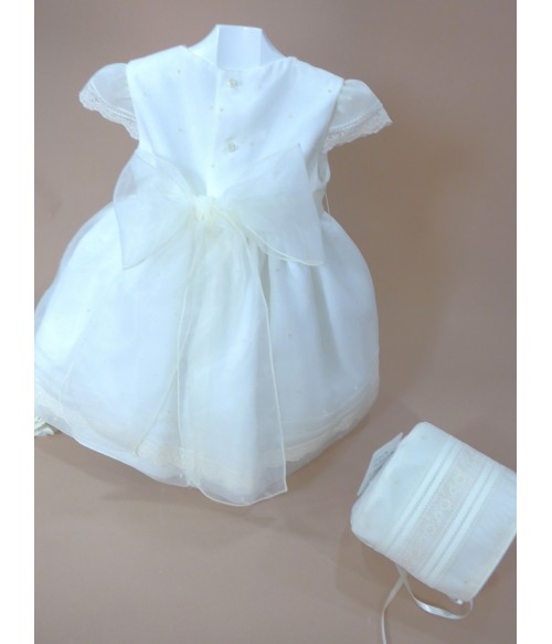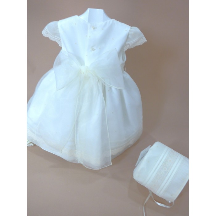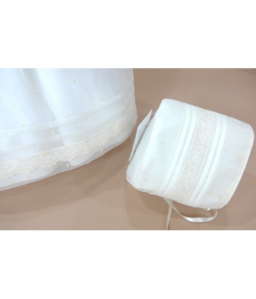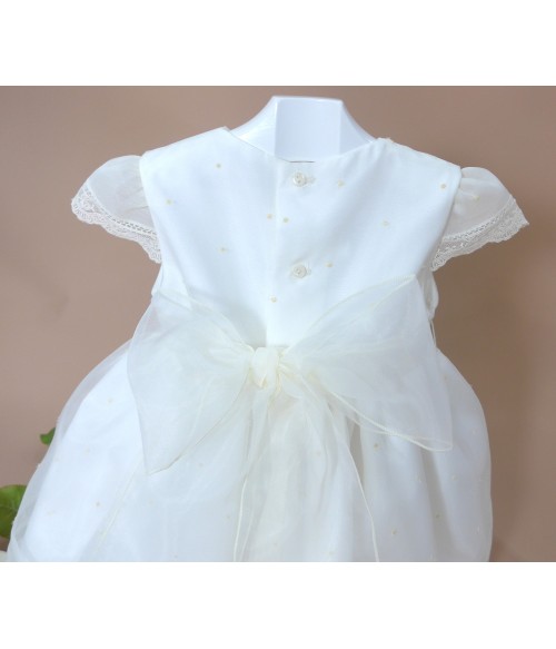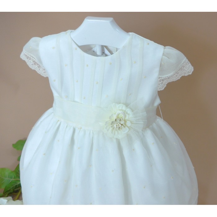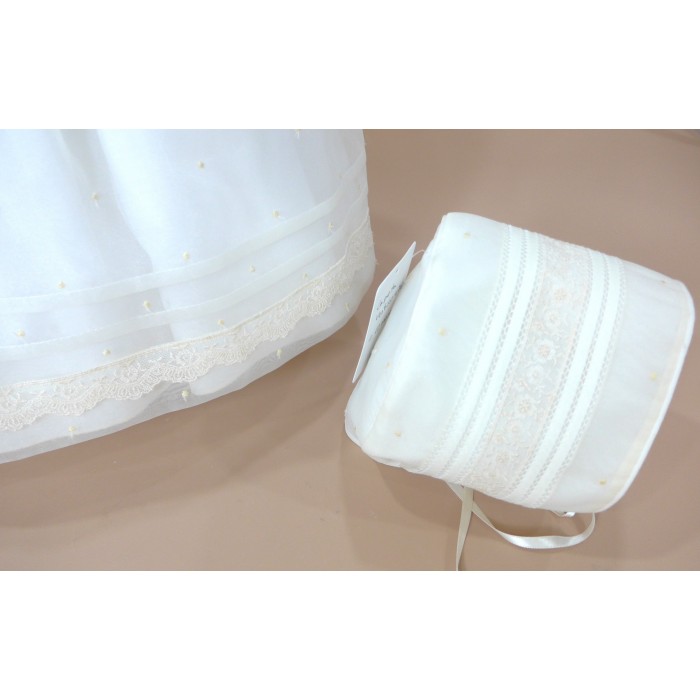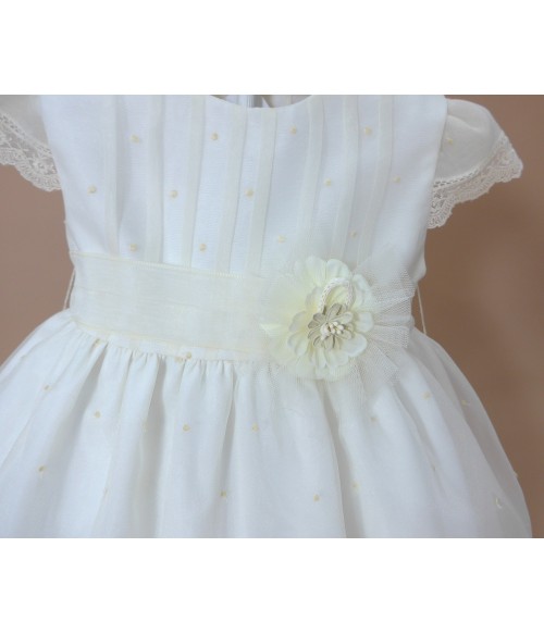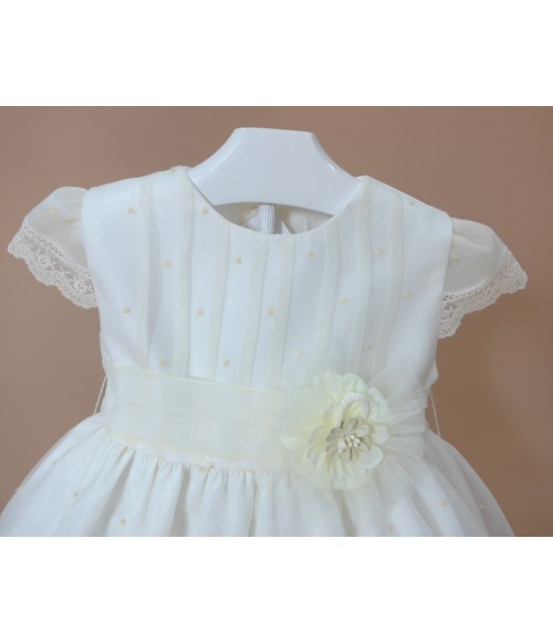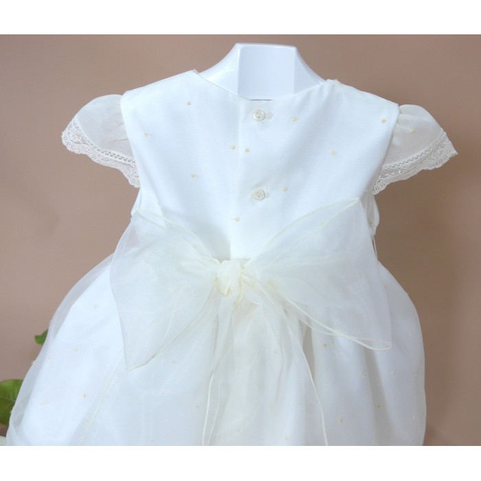 Vestido de organza beig todo bordado de manguita corta con puntilla bordada.