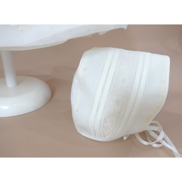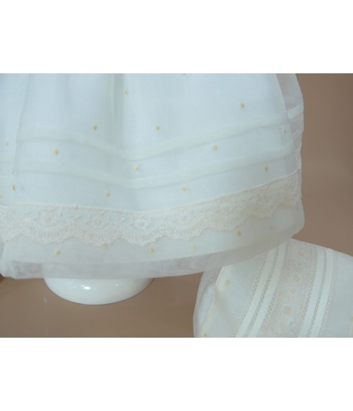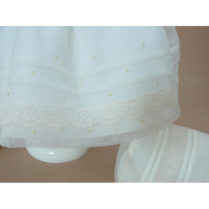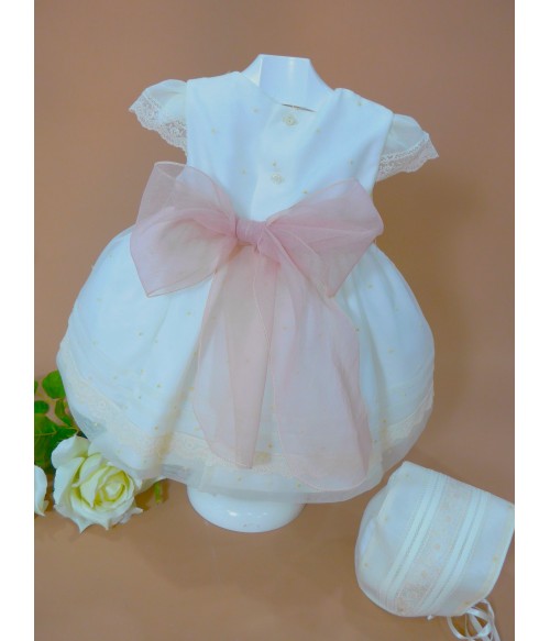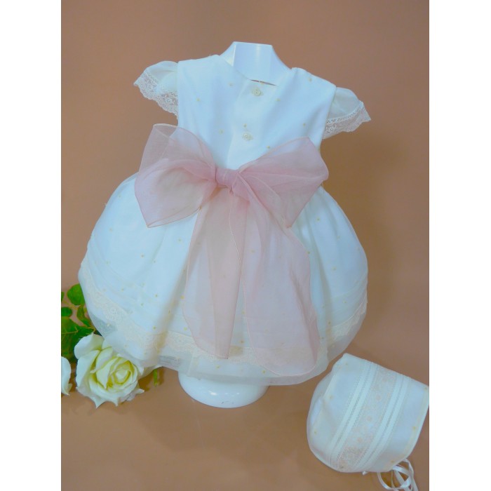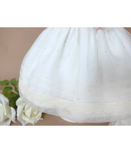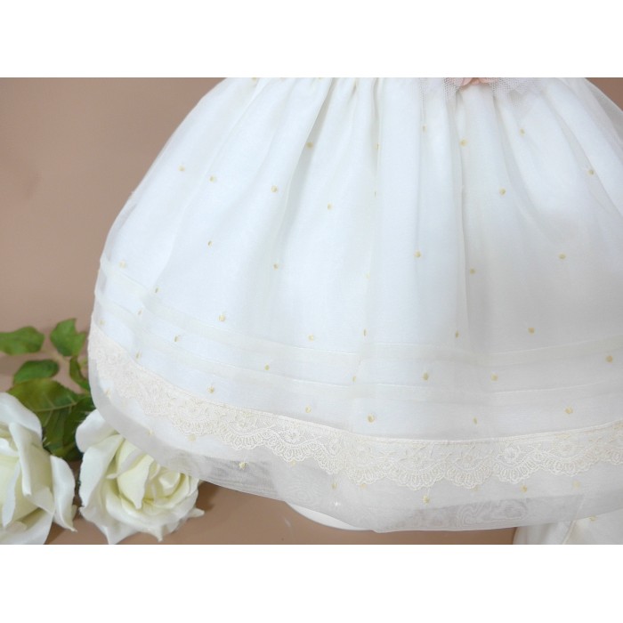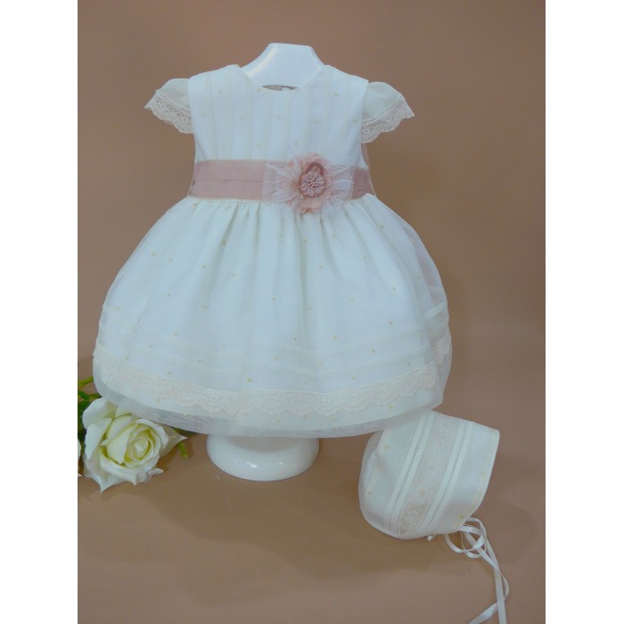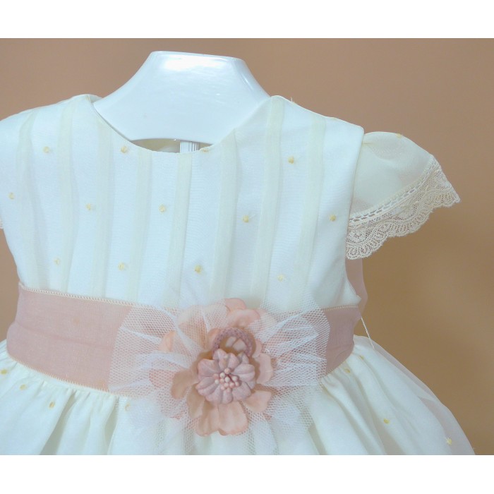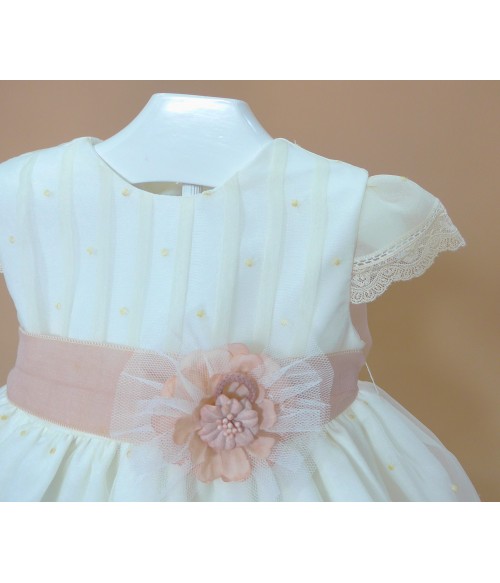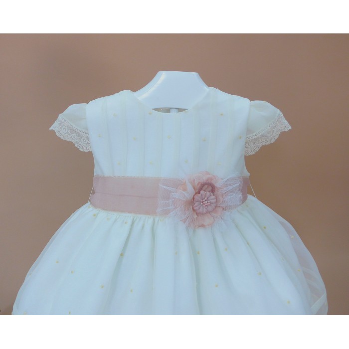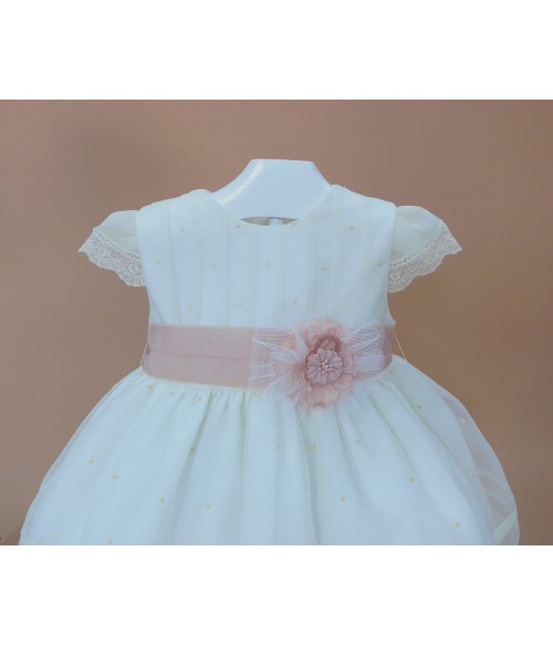 Vestido organza bordada manga corta con fajin de organza rosa empolvado.