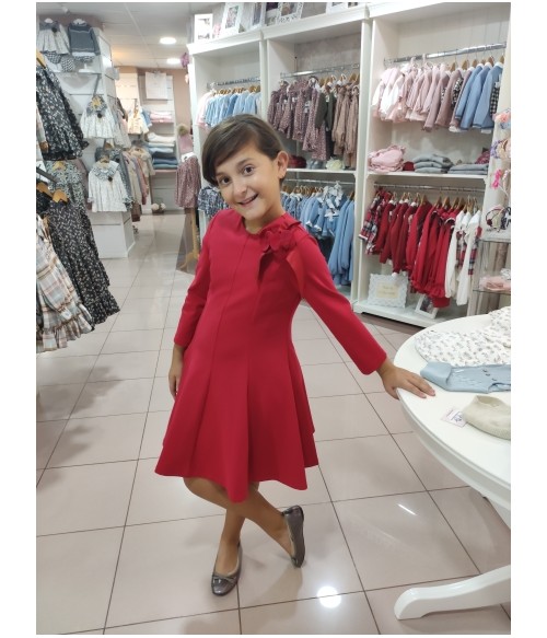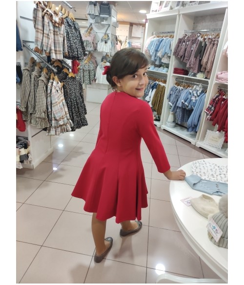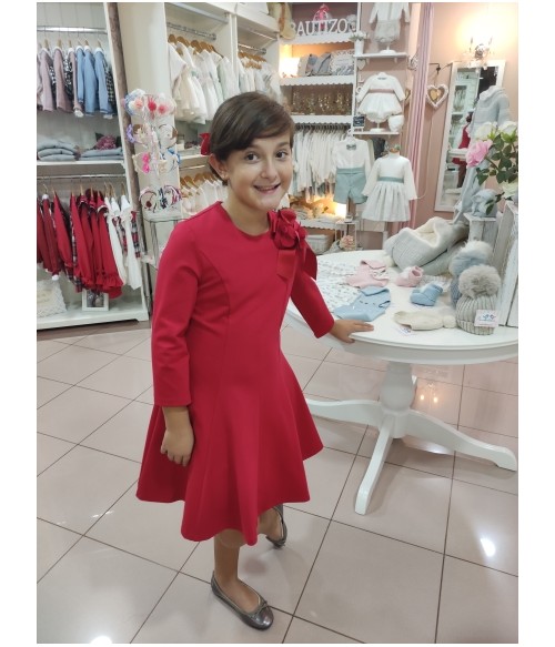 Vestido rojo de punto roma con vuelo y cancán. Detalle floral con cinta grosgaín en el hombro.