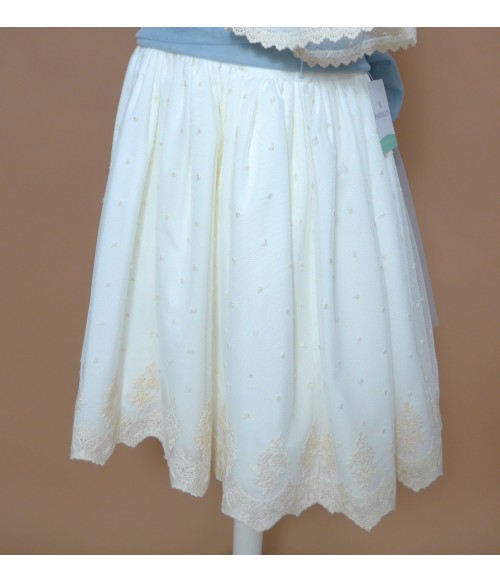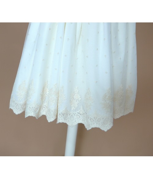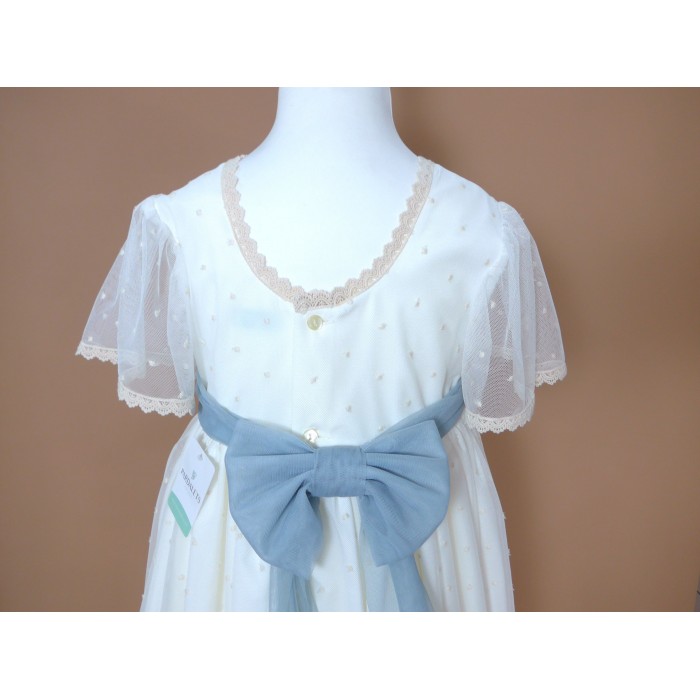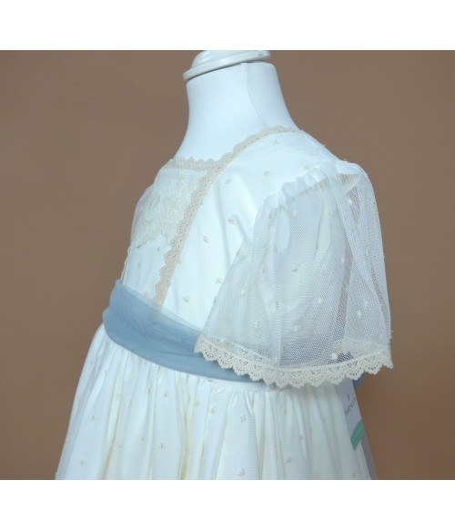 Vestido de tul bordado beig con mangas mariposa con remate de puntilla.