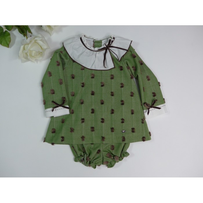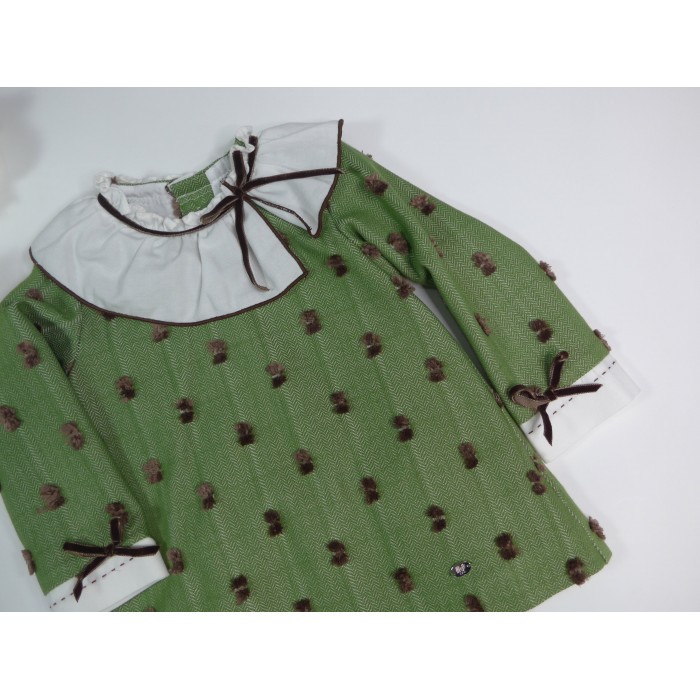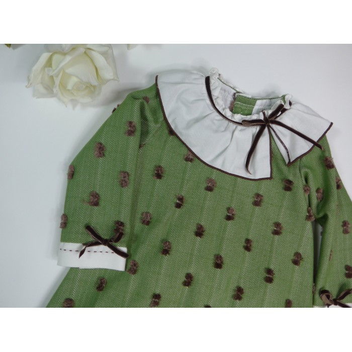 Vestido verde con plumeti marrón, cuello volante blanco festoneado en chocolate con lacitos de terciopelo chocolate en cuello y mangas. Pololo a juego.