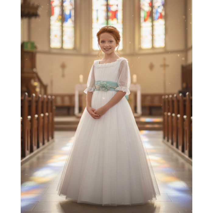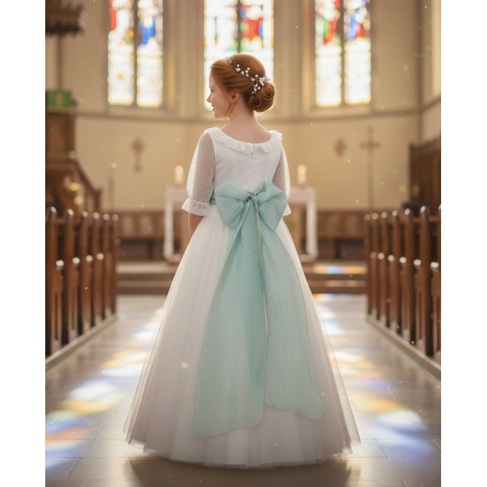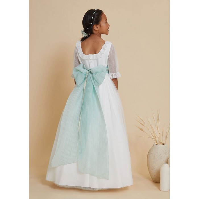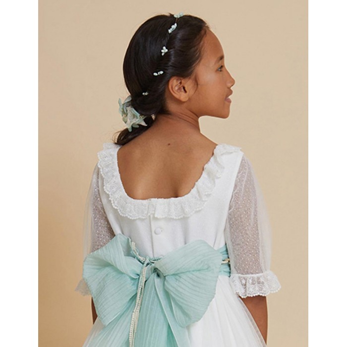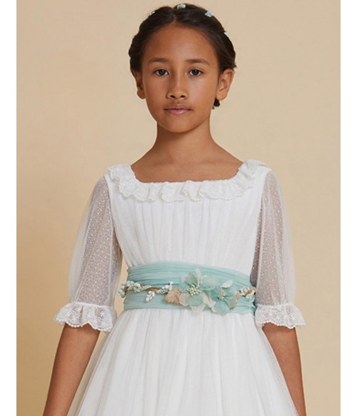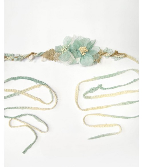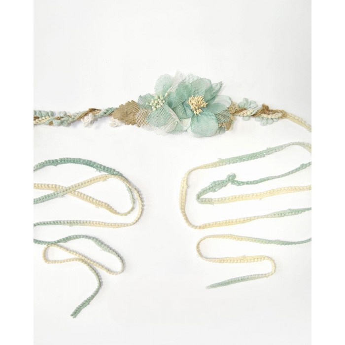 Fajín de tul verde con sobrefajín de flores verdes y rosas.